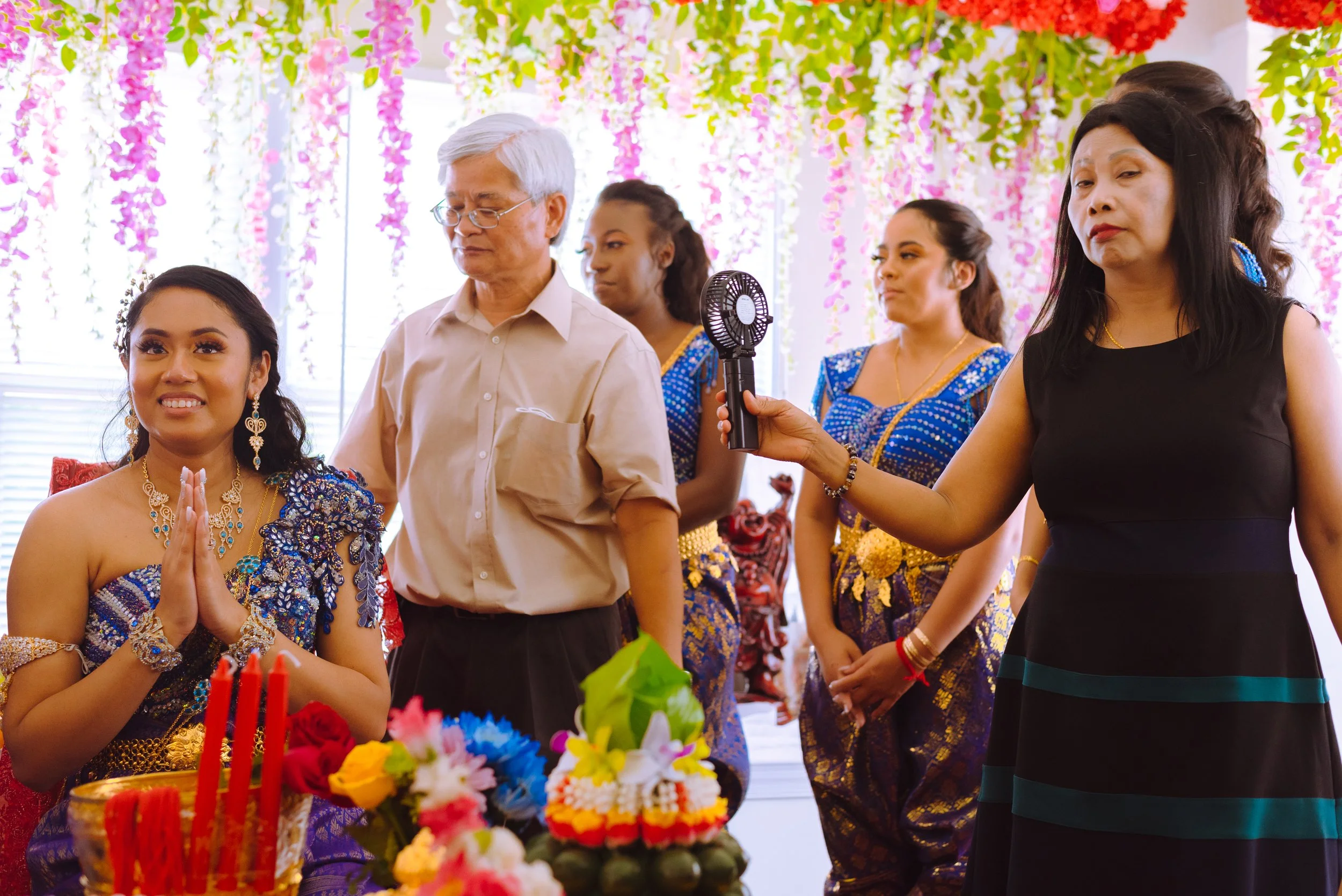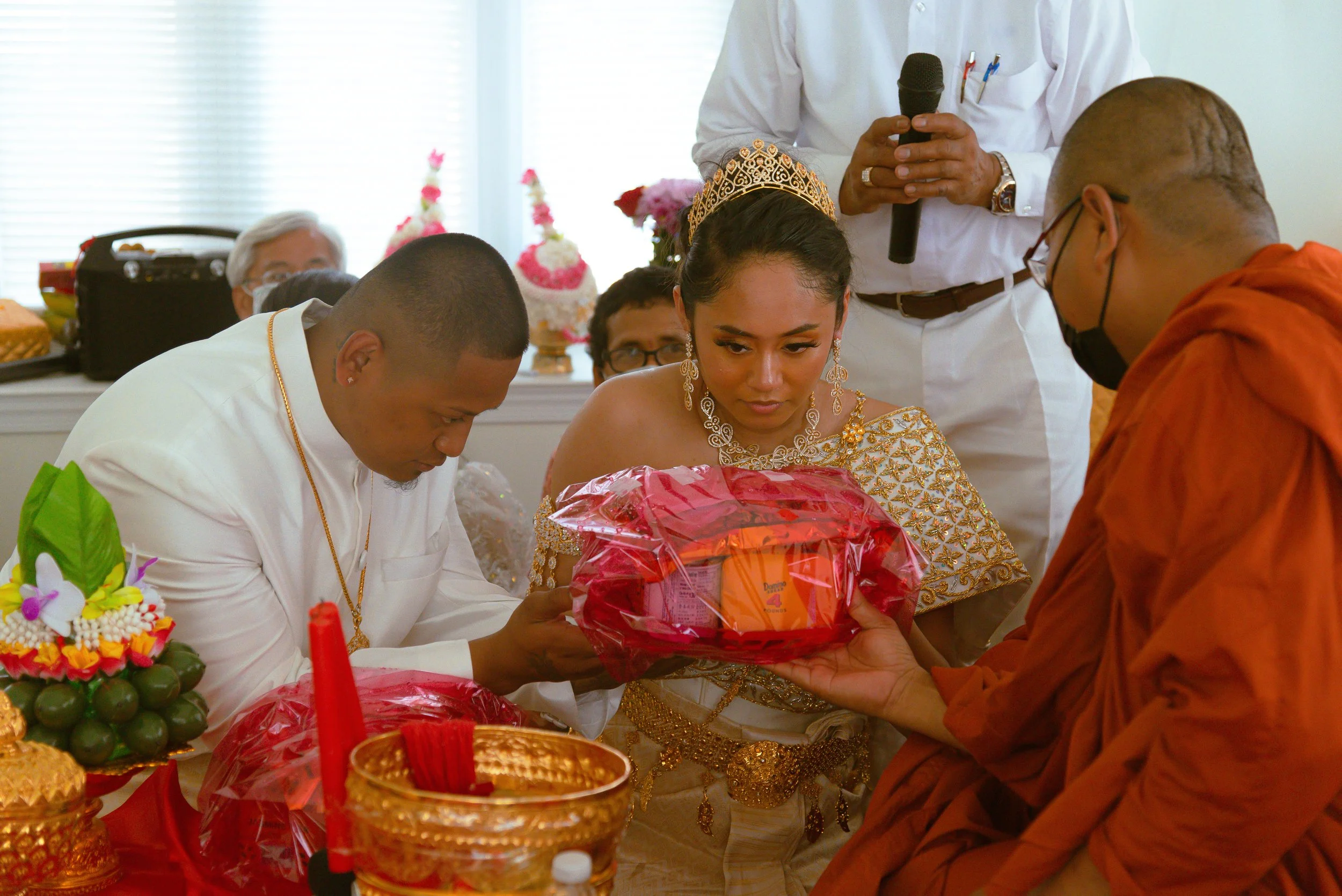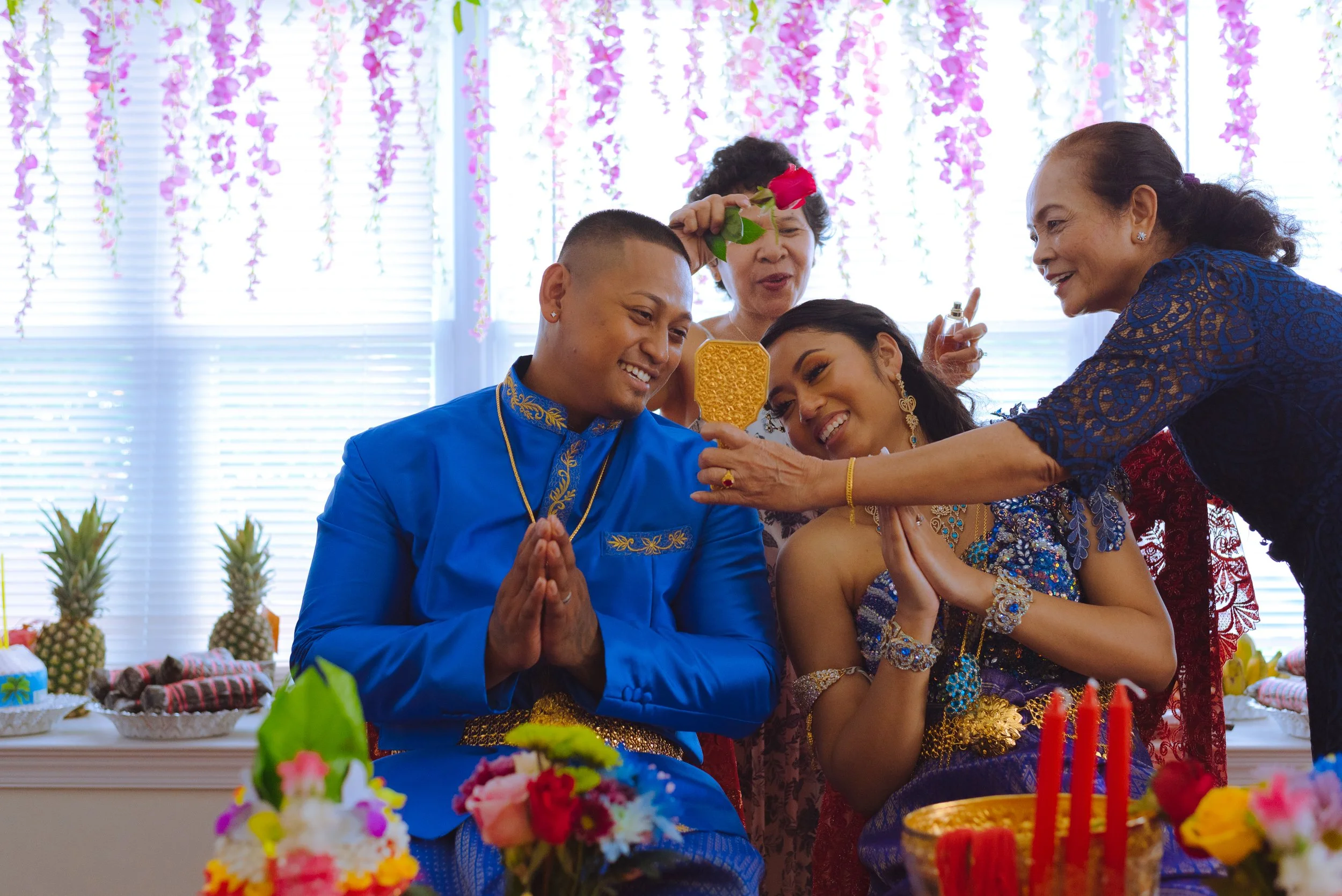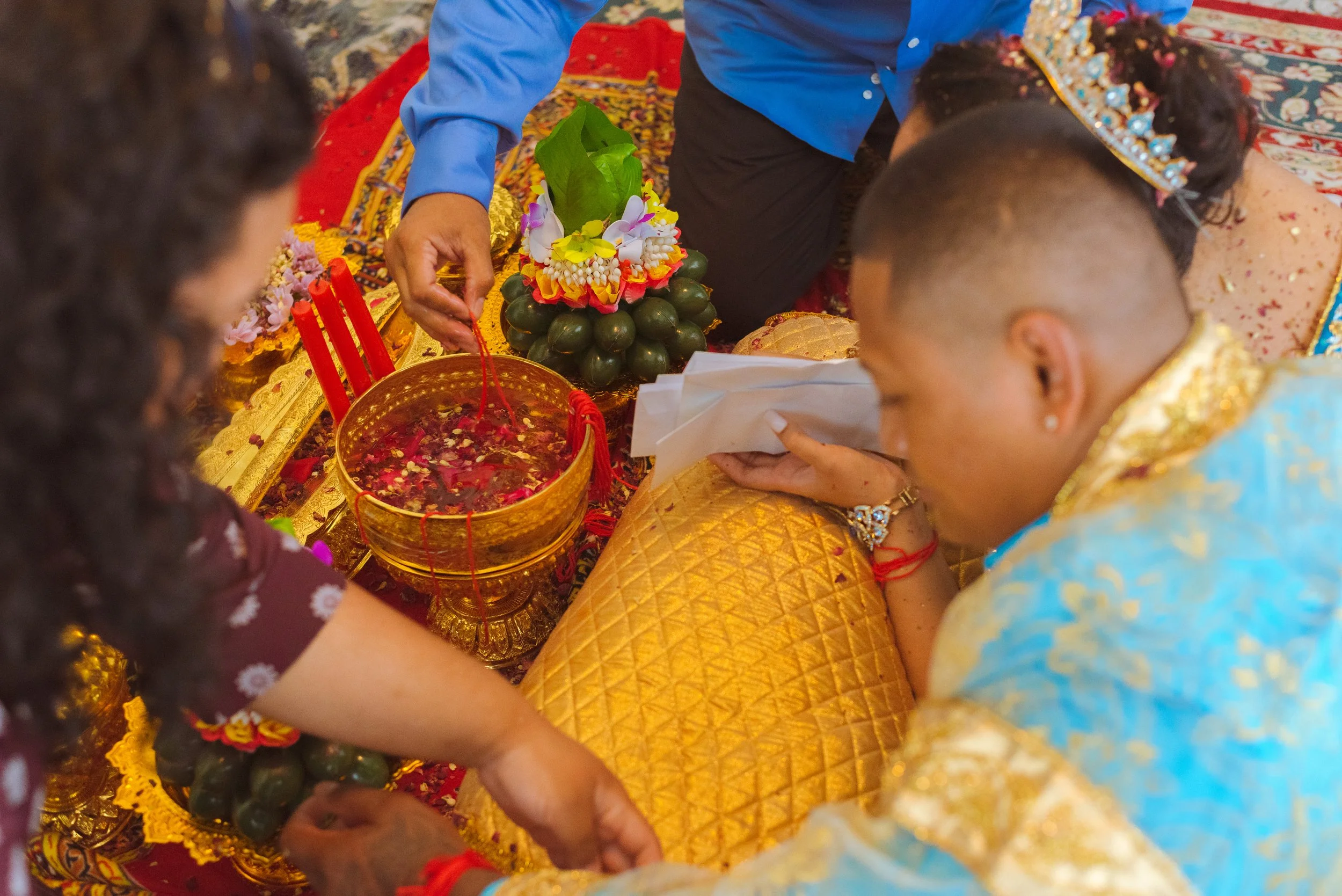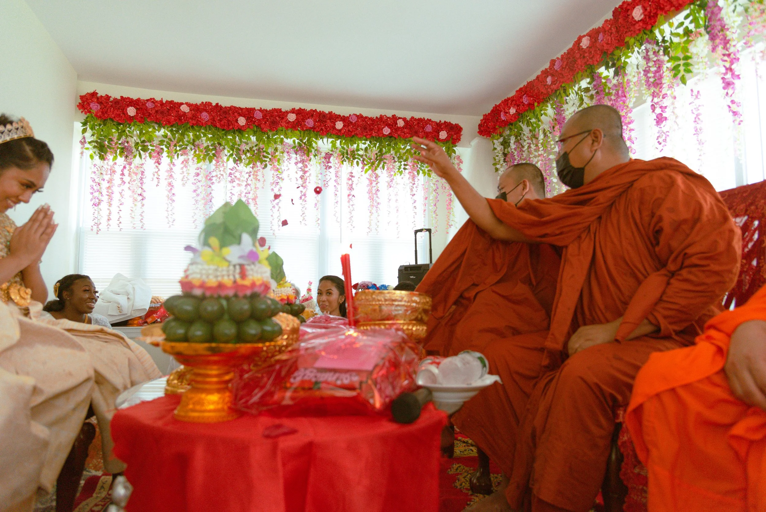 A majority Buddhist country, monks have a crucial role in Cambodian culture, including weddings. During this part of the ceremony, monks come to the home to bless the couple and their immediate family, who are all gathered in the sunroom. The monks lights special red candles before showering them in rose water while singing blessings. Everyone tries their best to remain silent, their heads are bowed and hands in prayer during the ceremony. Afterward, the bride and groom shows their respect and appreciation to the monks through the offering of gifts.