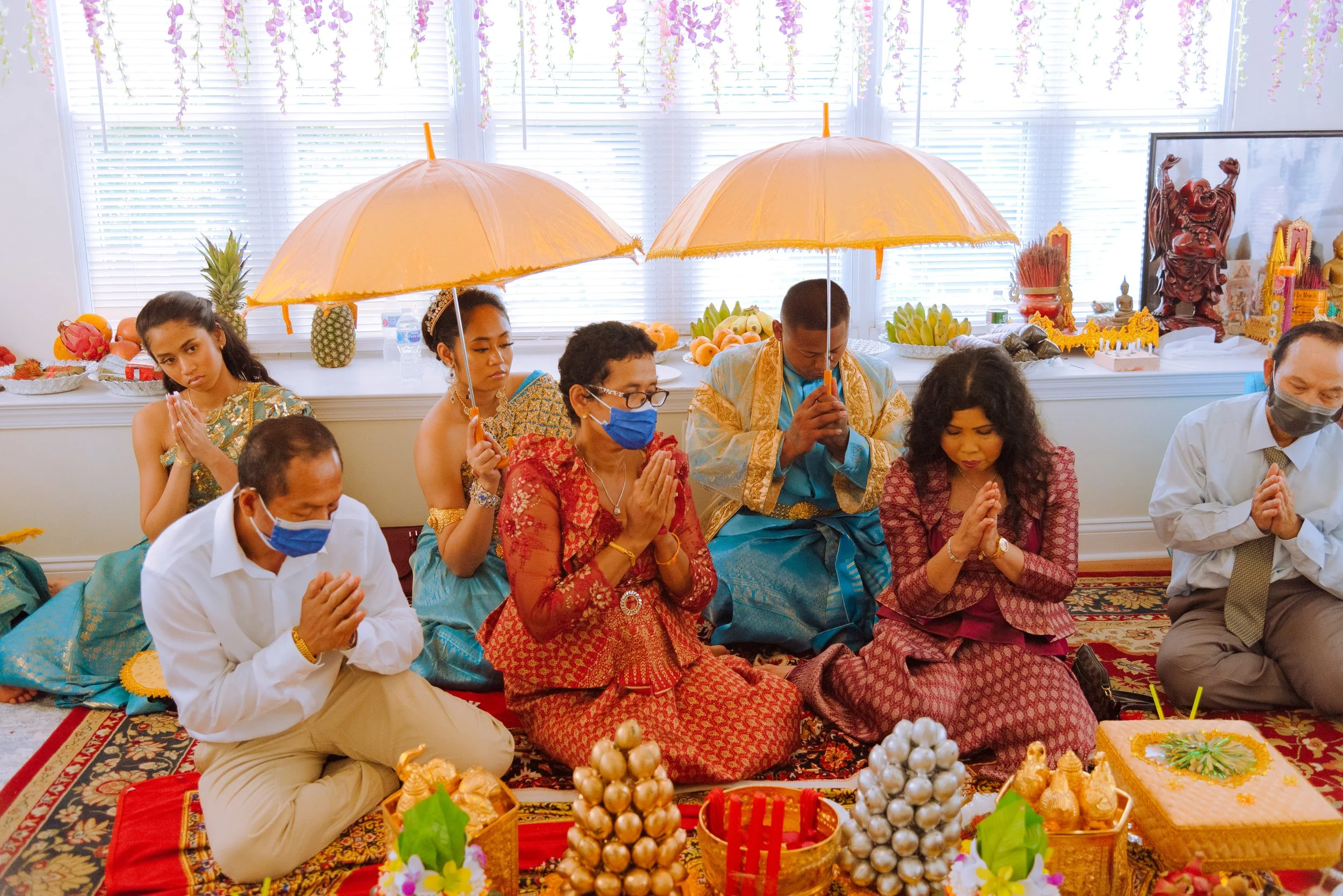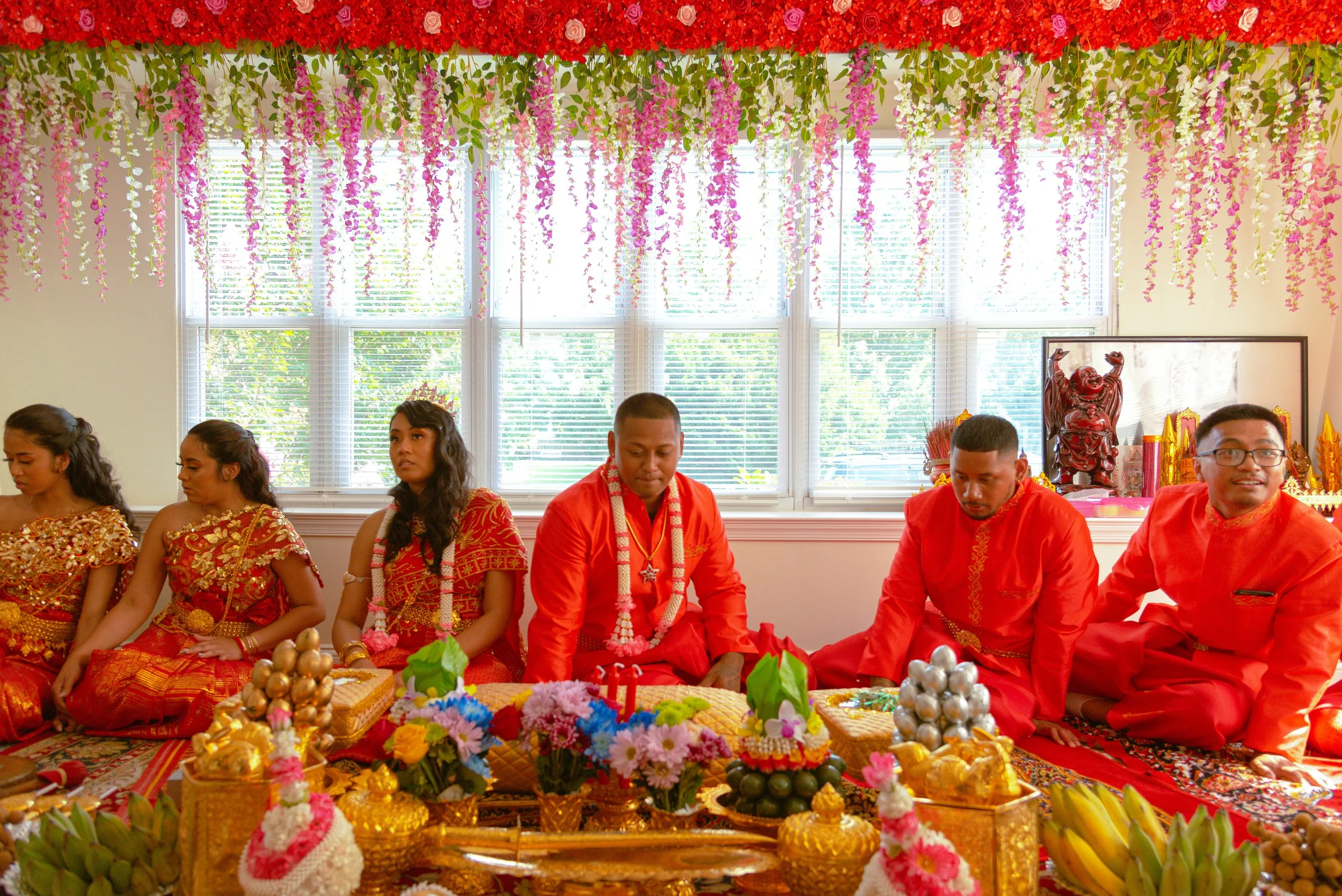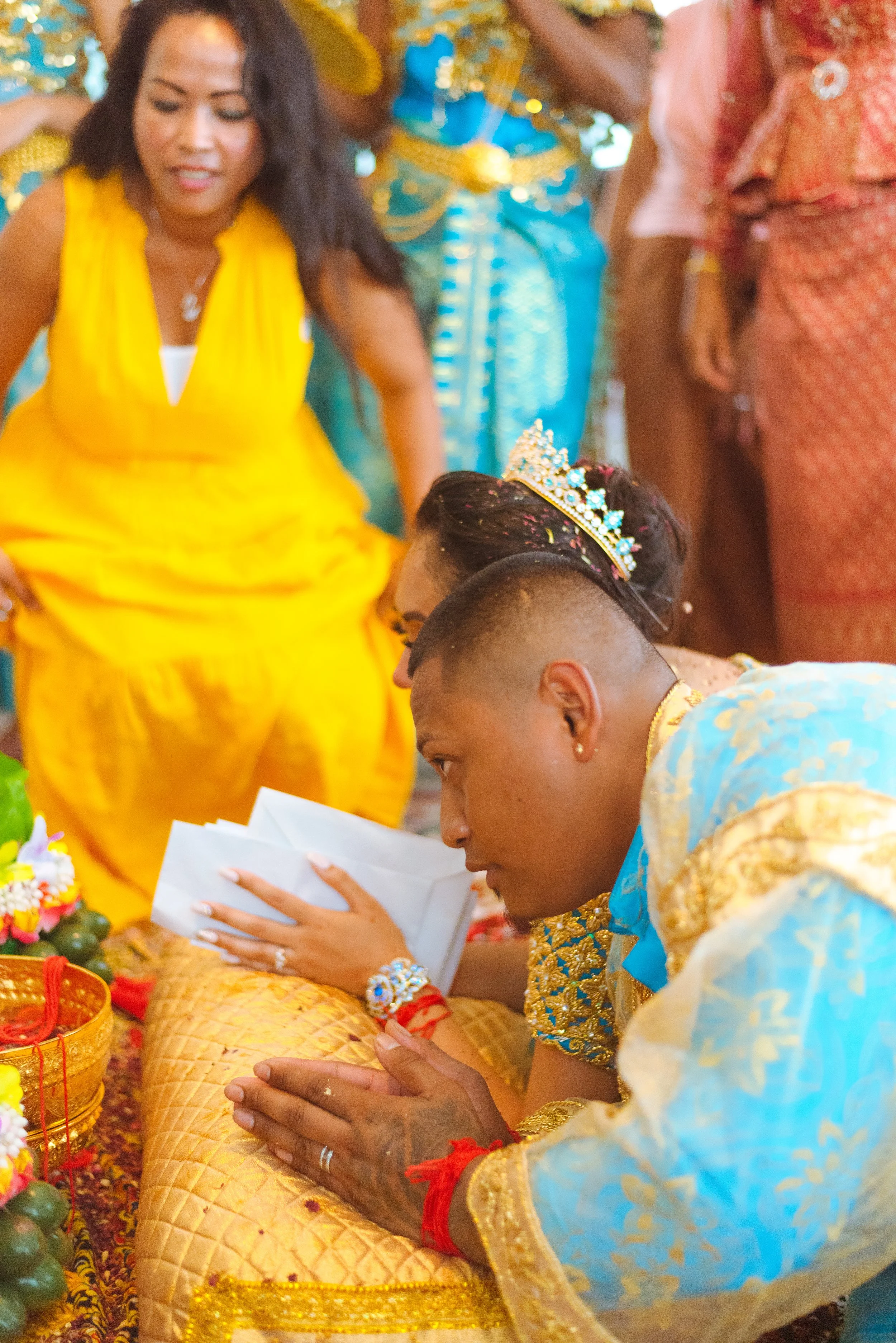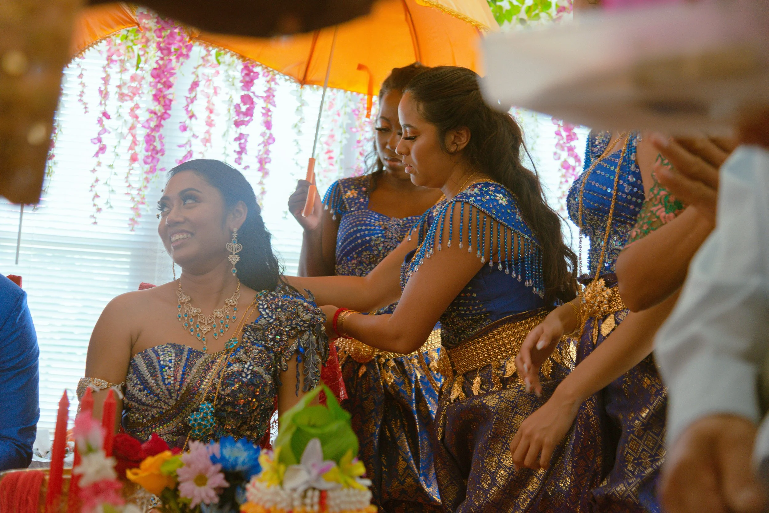 A majority Buddhist country, monks have a crucial role in Cambodian culture, including weddings. During this part of the ceremony, monks come to the home to bless the couple and their immediate family, who are all gathered in the sunroom. The monks lights special red candles before showering them in rose water while singing blessings. Everyone tries their best to remain silent, their heads are bowed and hands in prayer during the ceremony. Afterward, the bride and groom shows their respect and appreciation to the monks through the offering of gifts.