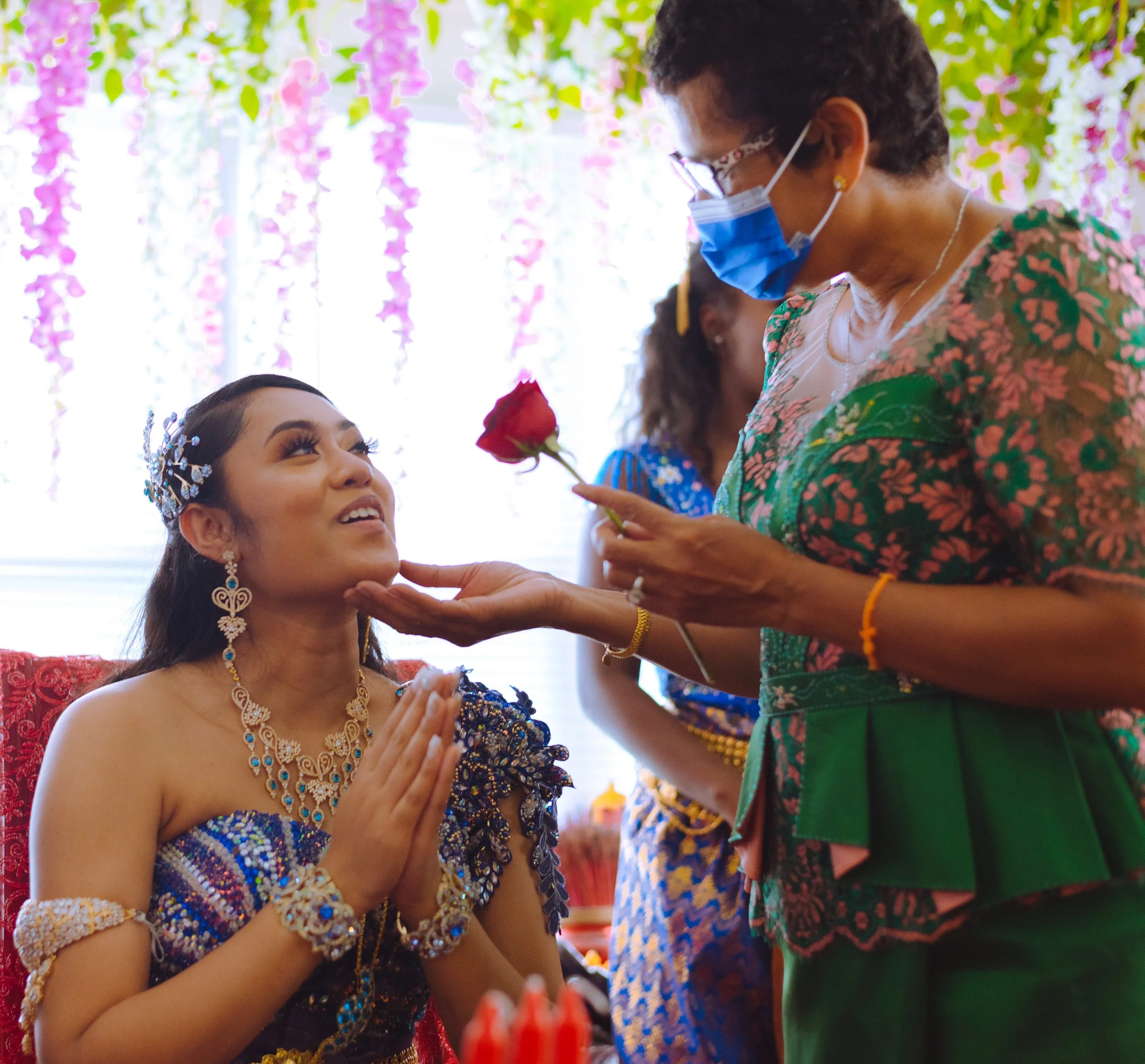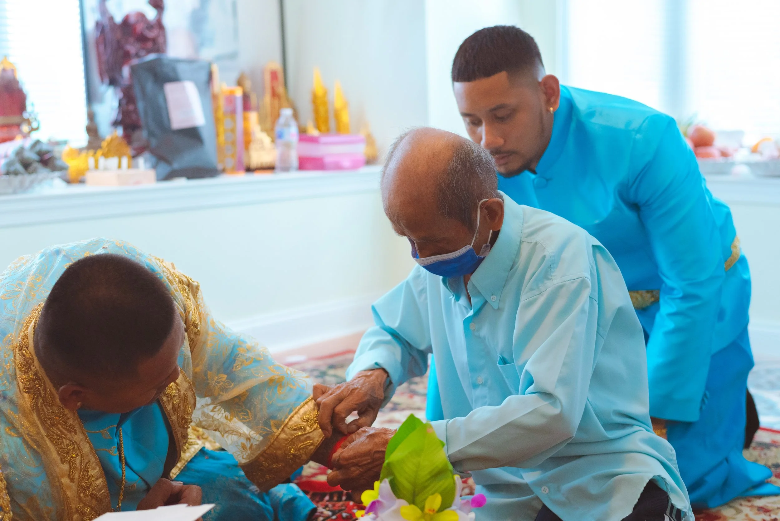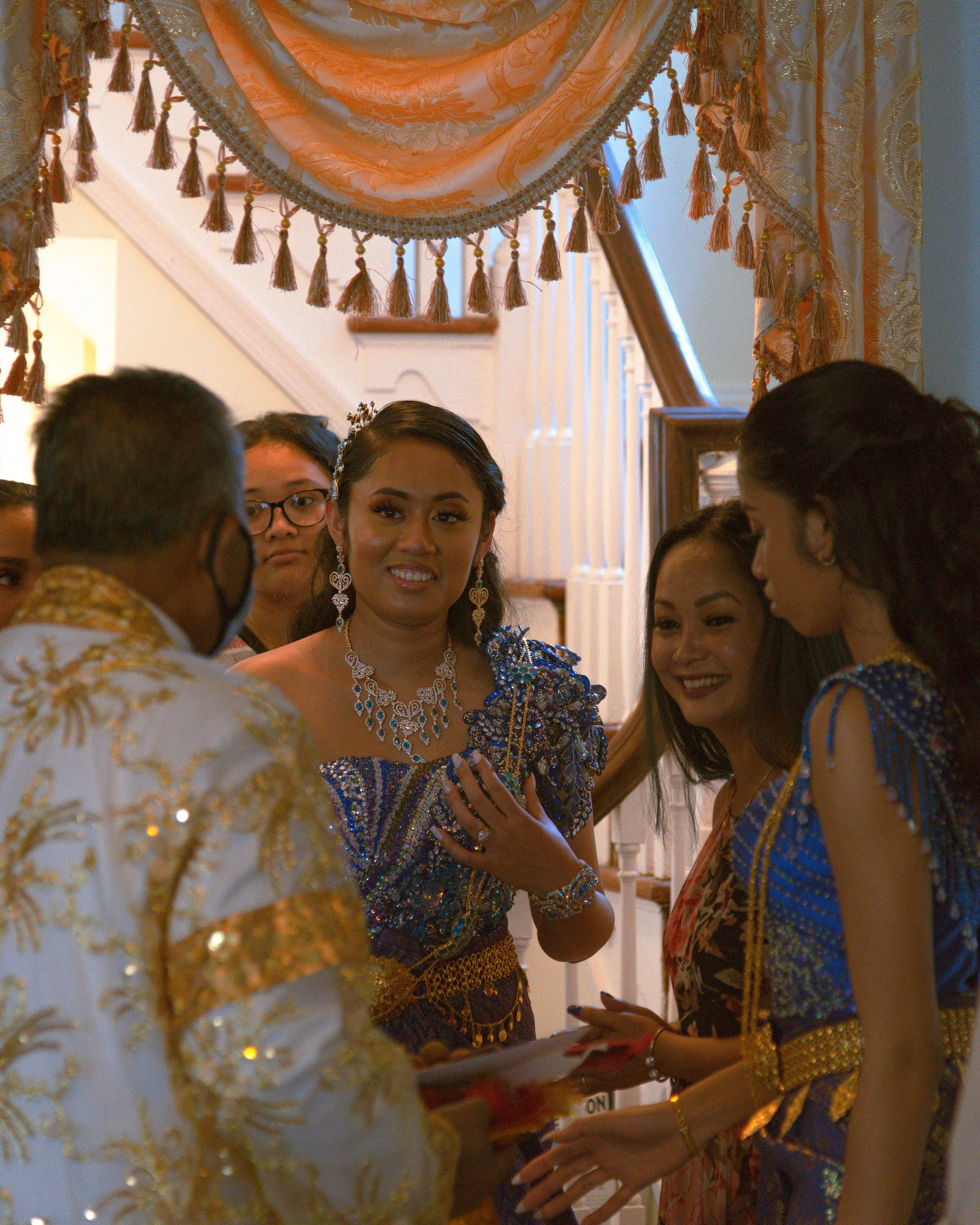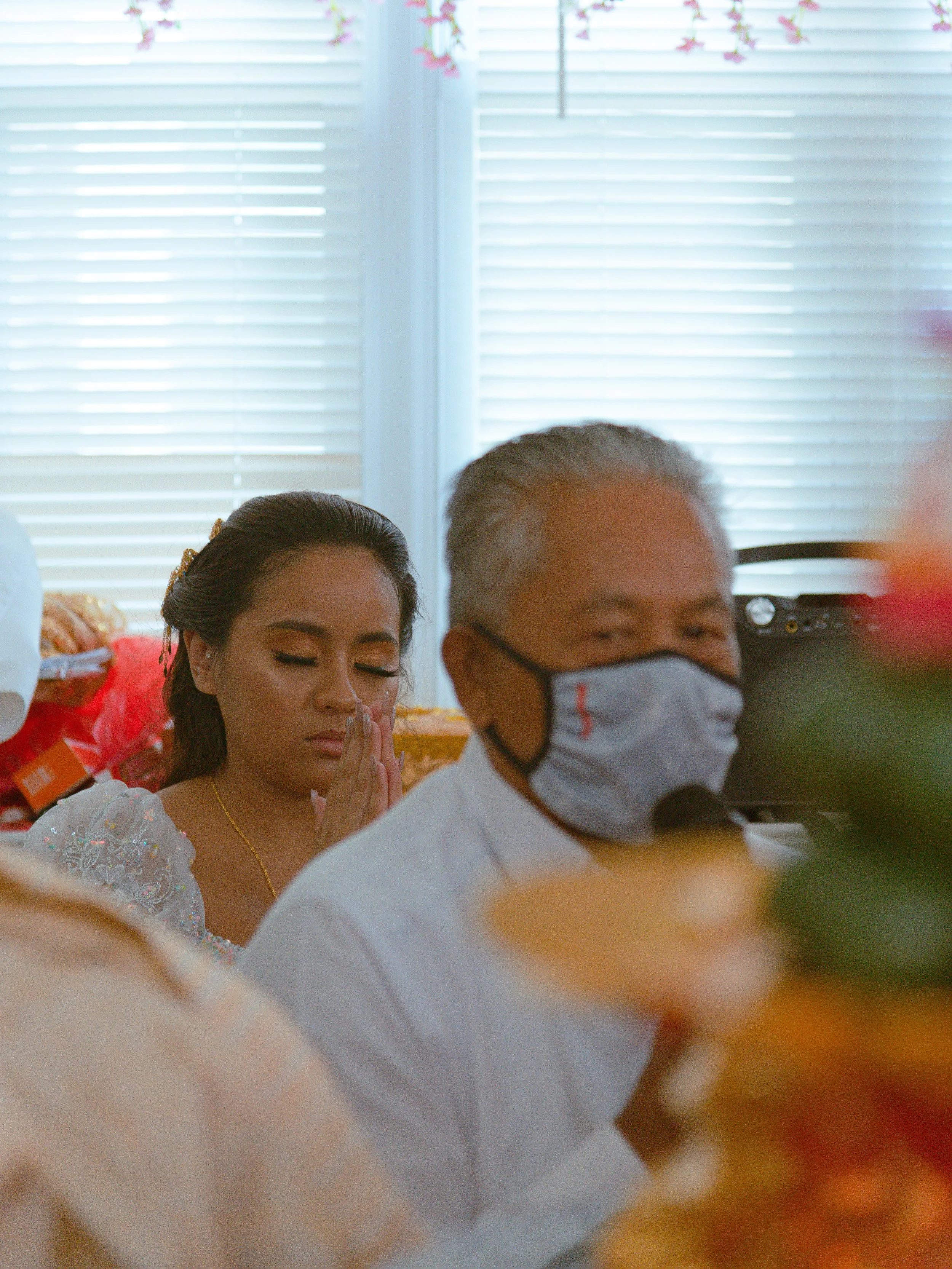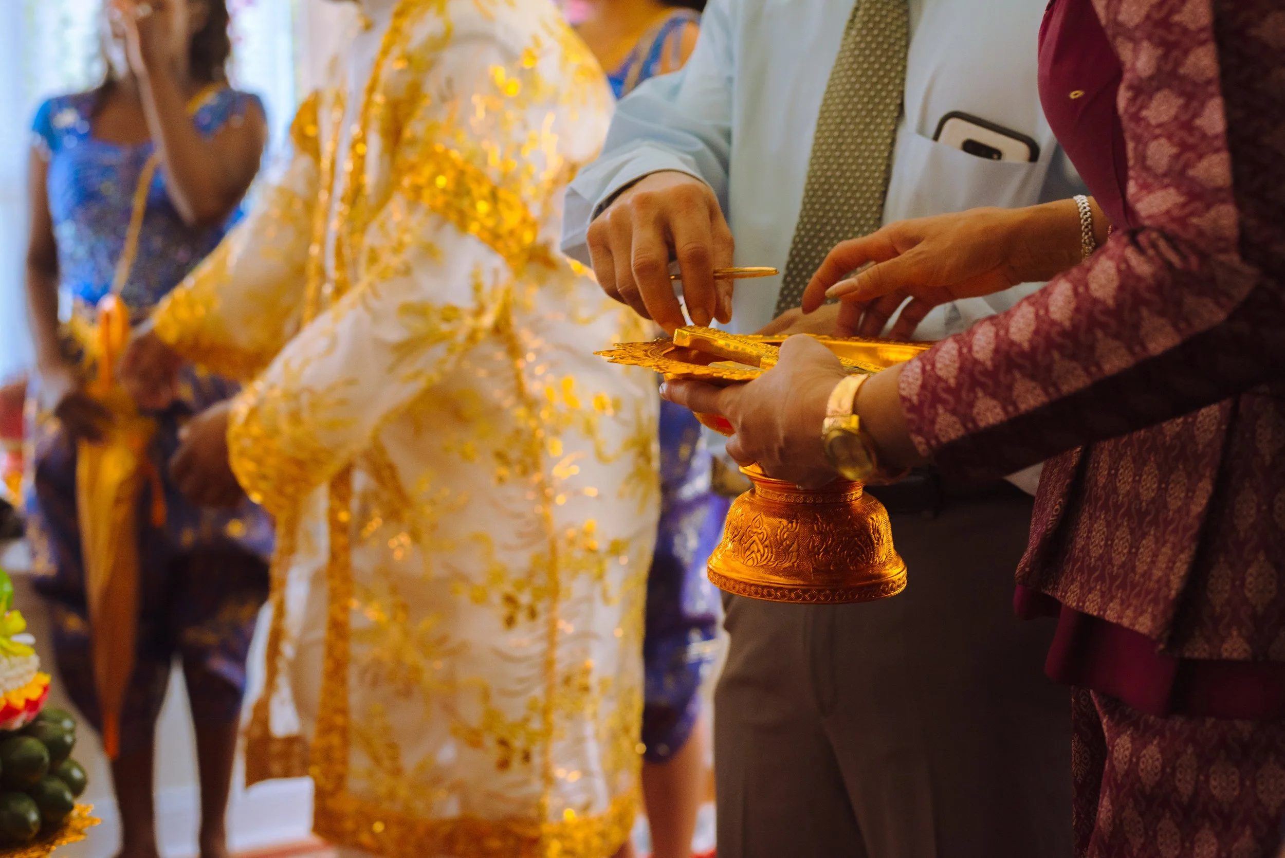 A majority Buddhist country, monks have a crucial role in Cambodian culture, including weddings. During this part of the ceremony, monks come to the home to bless the couple and their immediate family, who are all gathered in the sunroom. The monks lights special red candles before showering them in rose water while singing blessings. Everyone tries their best to remain silent, their heads are bowed and hands in prayer during the ceremony. Afterward, the bride and groom shows their respect and appreciation to the monks through the offering of gifts.