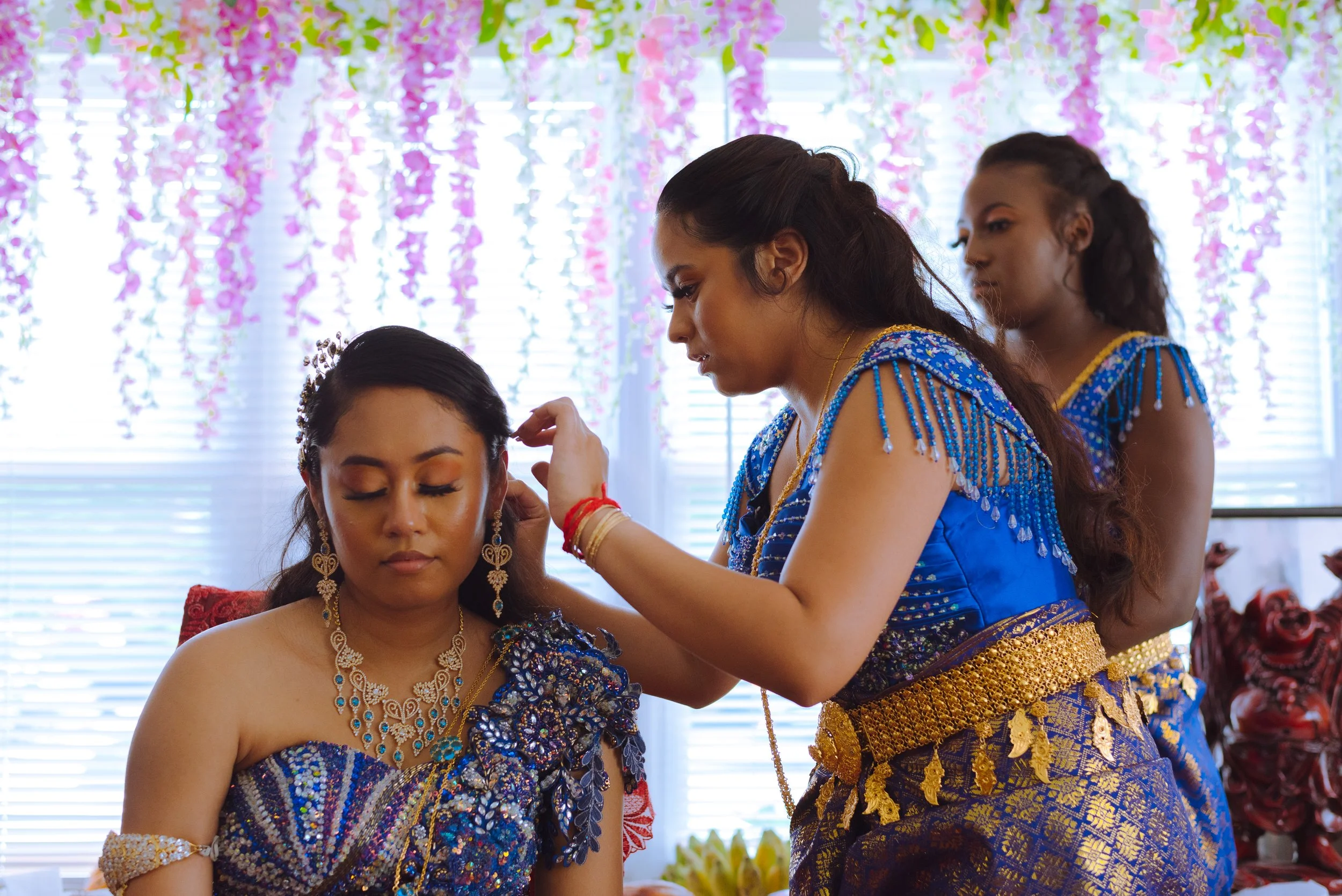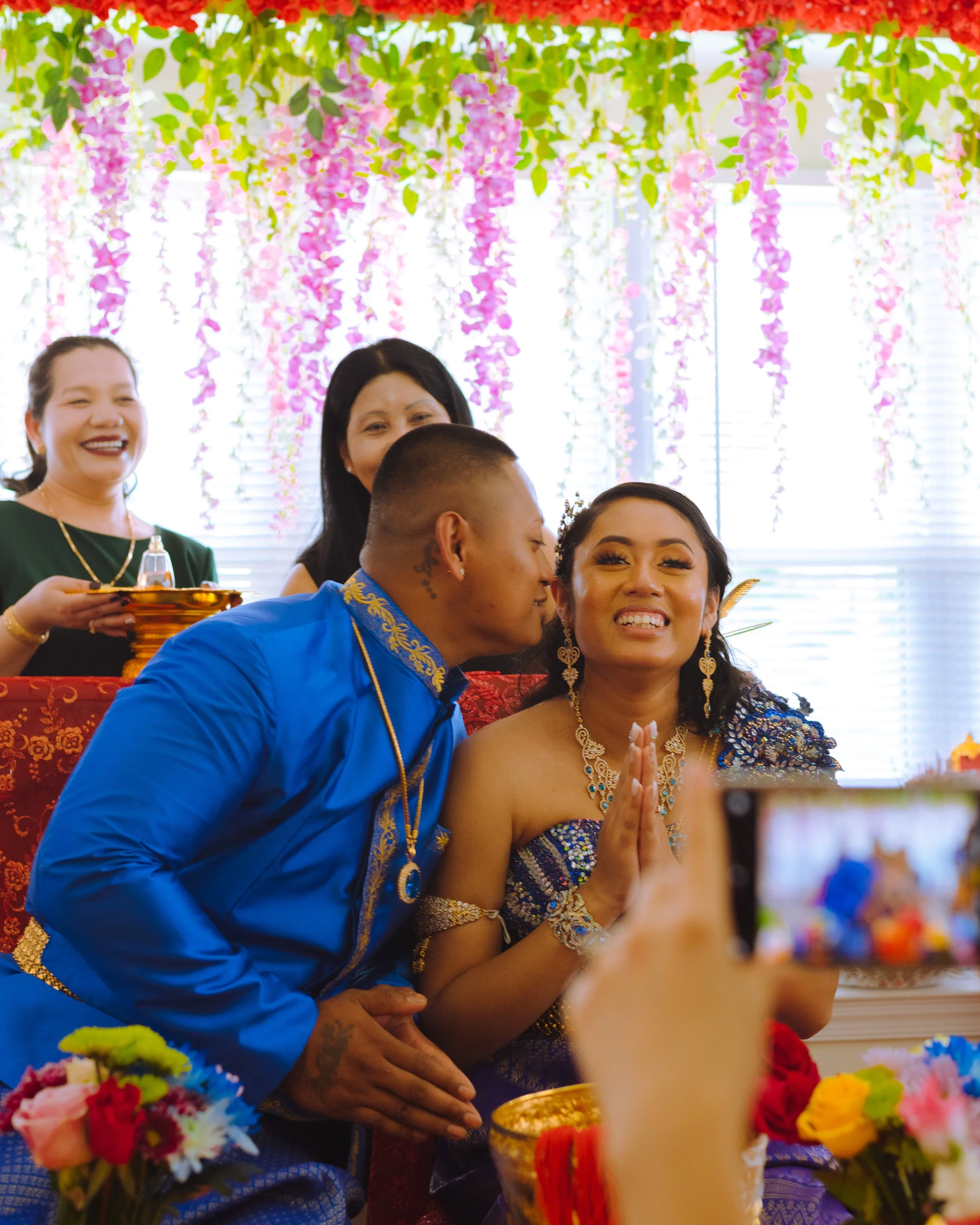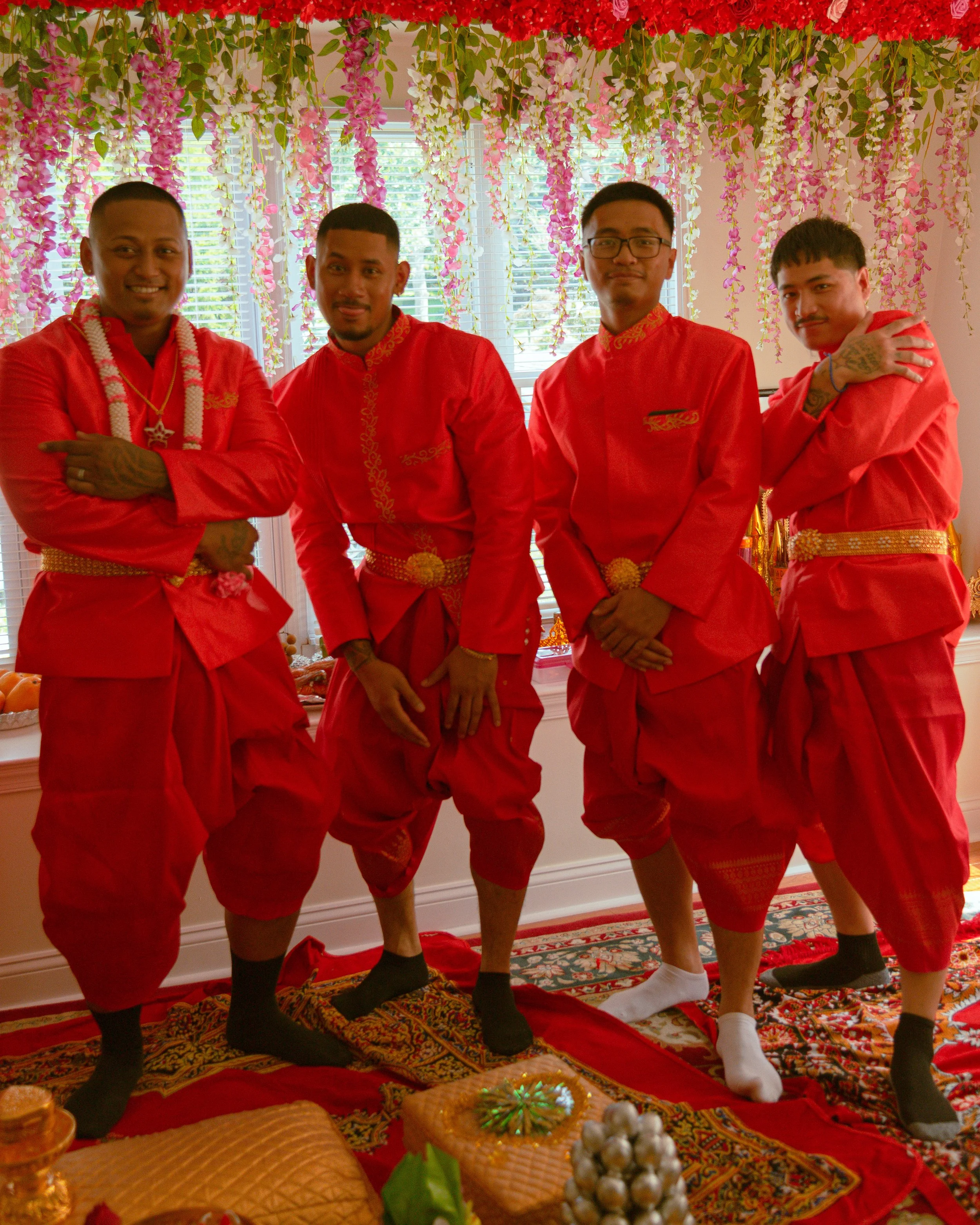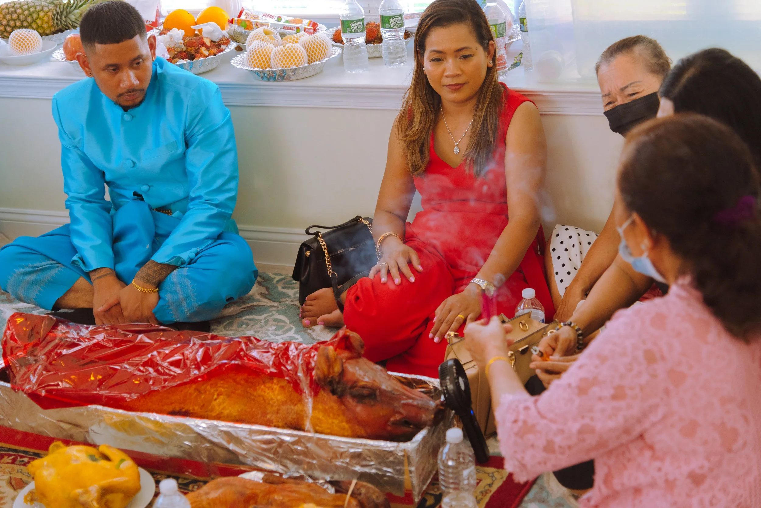 A majority Buddhist country, monks have a crucial role in Cambodian culture, including weddings. During this part of the ceremony, monks come to the home to bless the couple and their immediate family, who are all gathered in the sunroom. The monks lights special red candles before showering them in rose water while singing blessings. Everyone tries their best to remain silent, their heads are bowed and hands in prayer during the ceremony. Afterward, the bride and groom shows their respect and appreciation to the monks through the offering of gifts.
