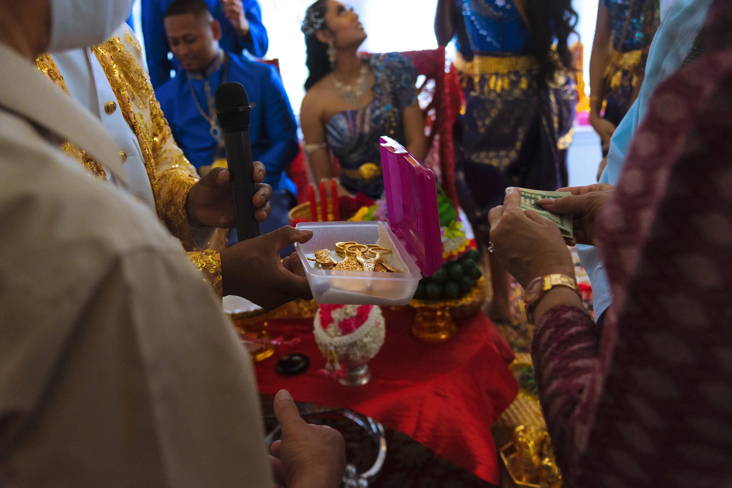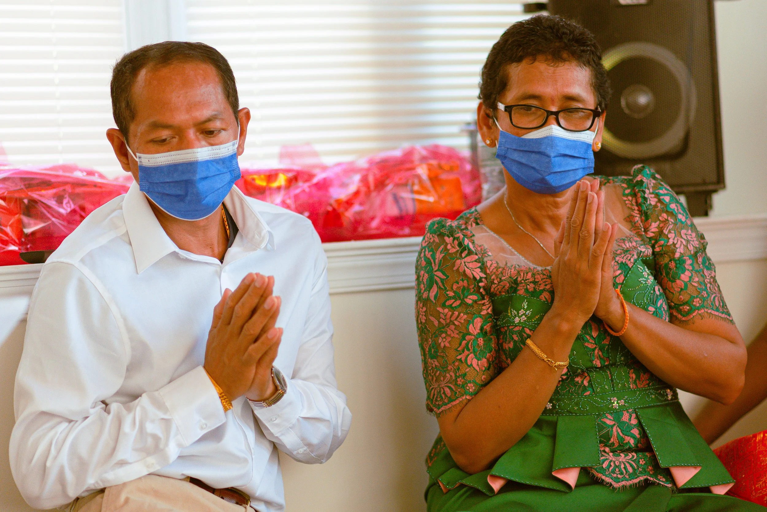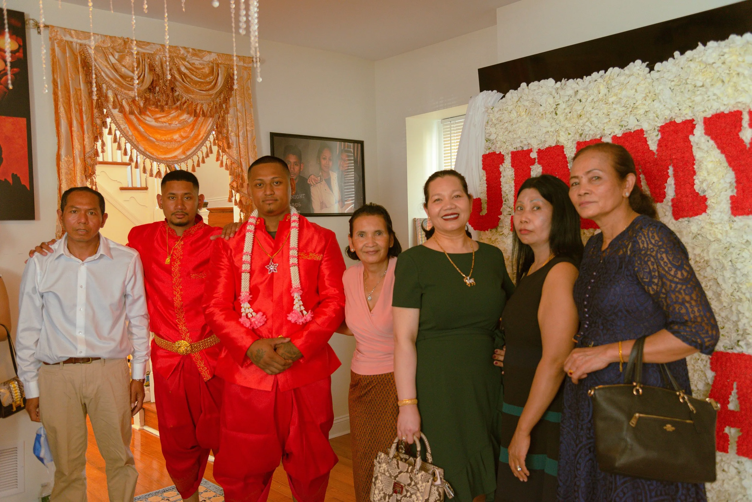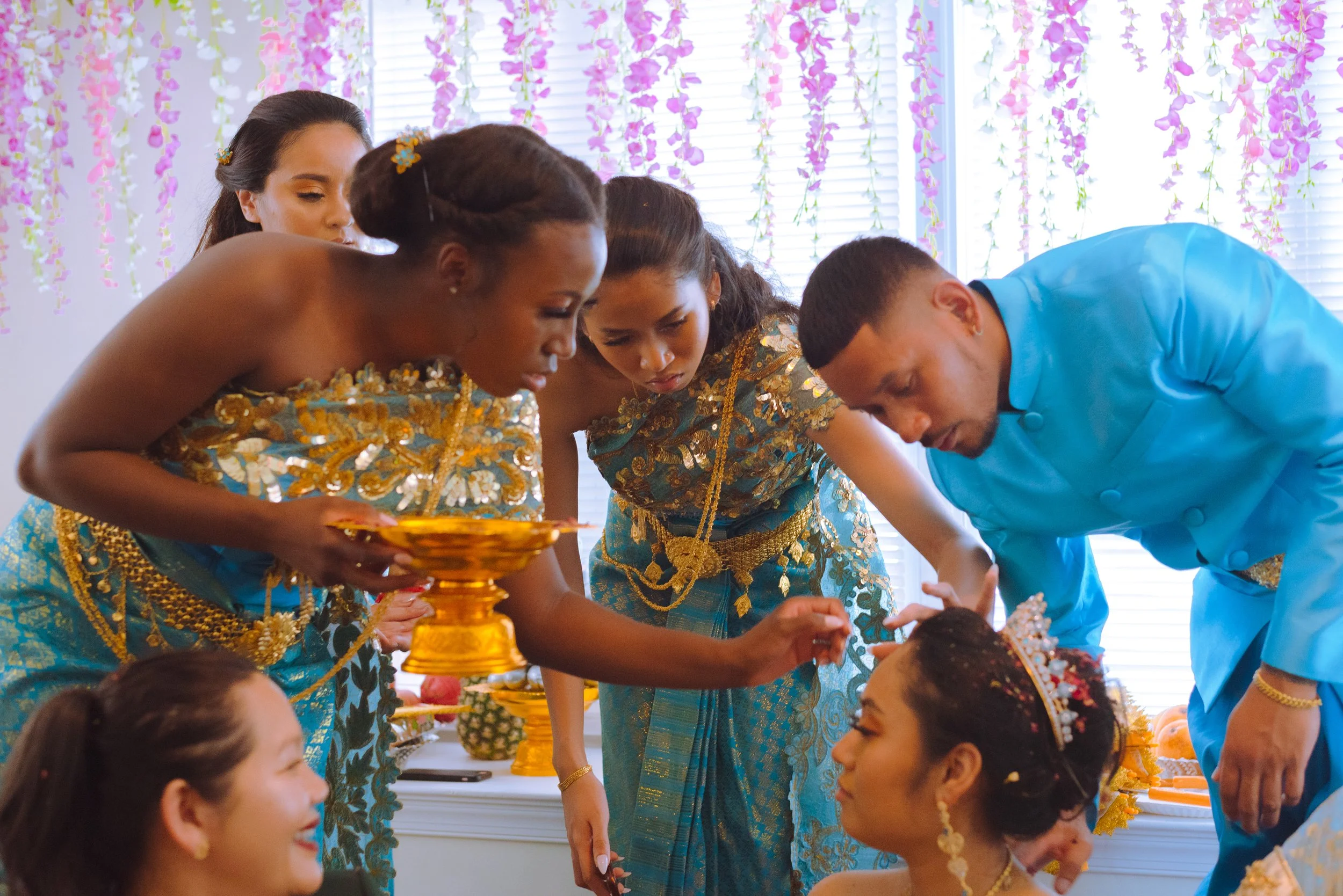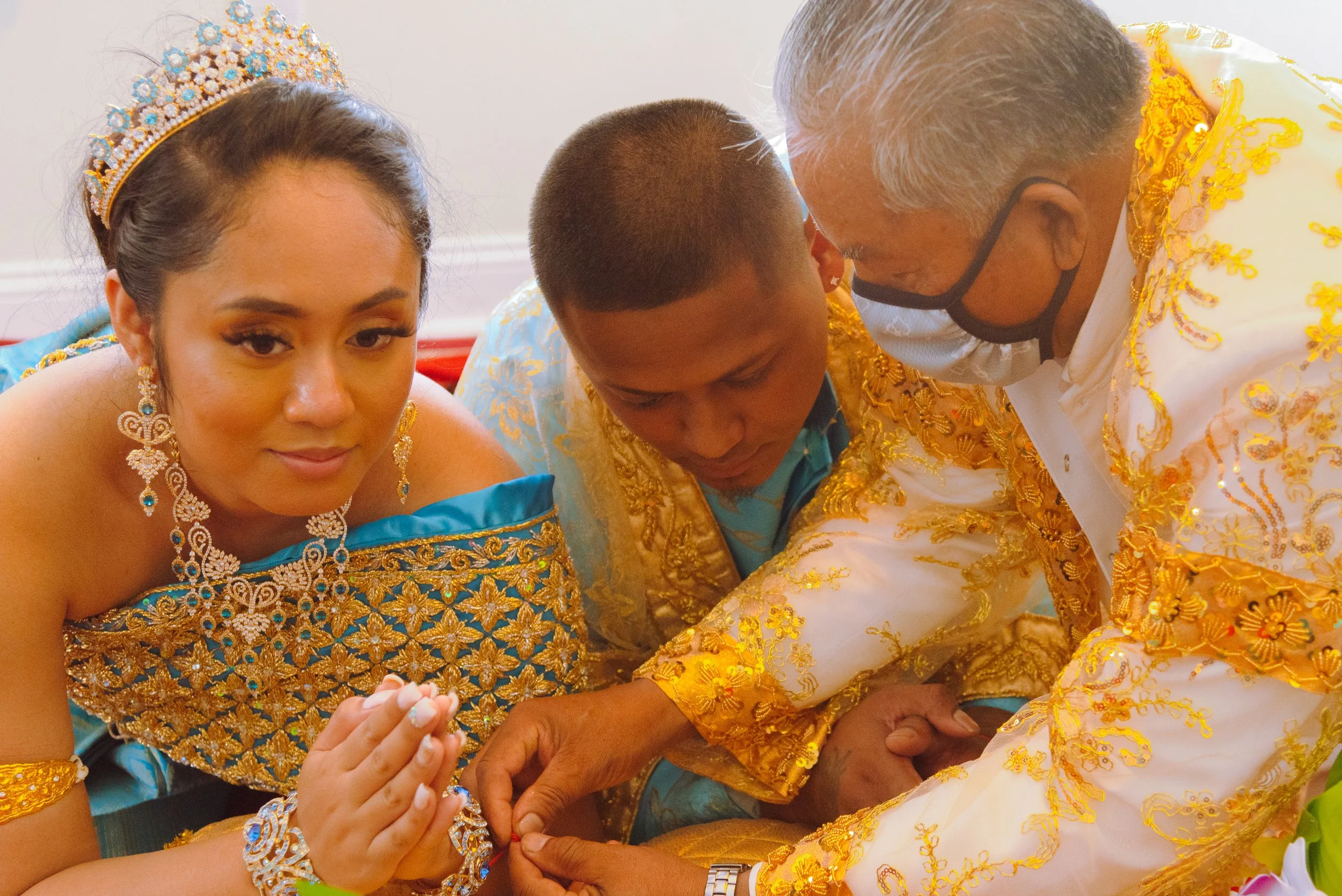 A majority Buddhist country, monks have a crucial role in Cambodian culture, including weddings. During this part of the ceremony, monks come to the home to bless the couple and their immediate family, who are all gathered in the sunroom. The monks lights special red candles before showering them in rose water while singing blessings. Everyone tries their best to remain silent, their heads are bowed and hands in prayer during the ceremony. Afterward, the bride and groom shows their respect and appreciation to the monks through the offering of gifts.