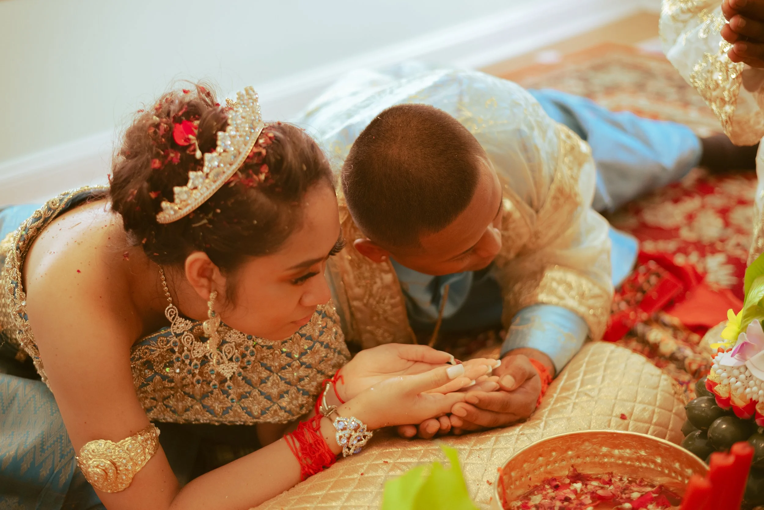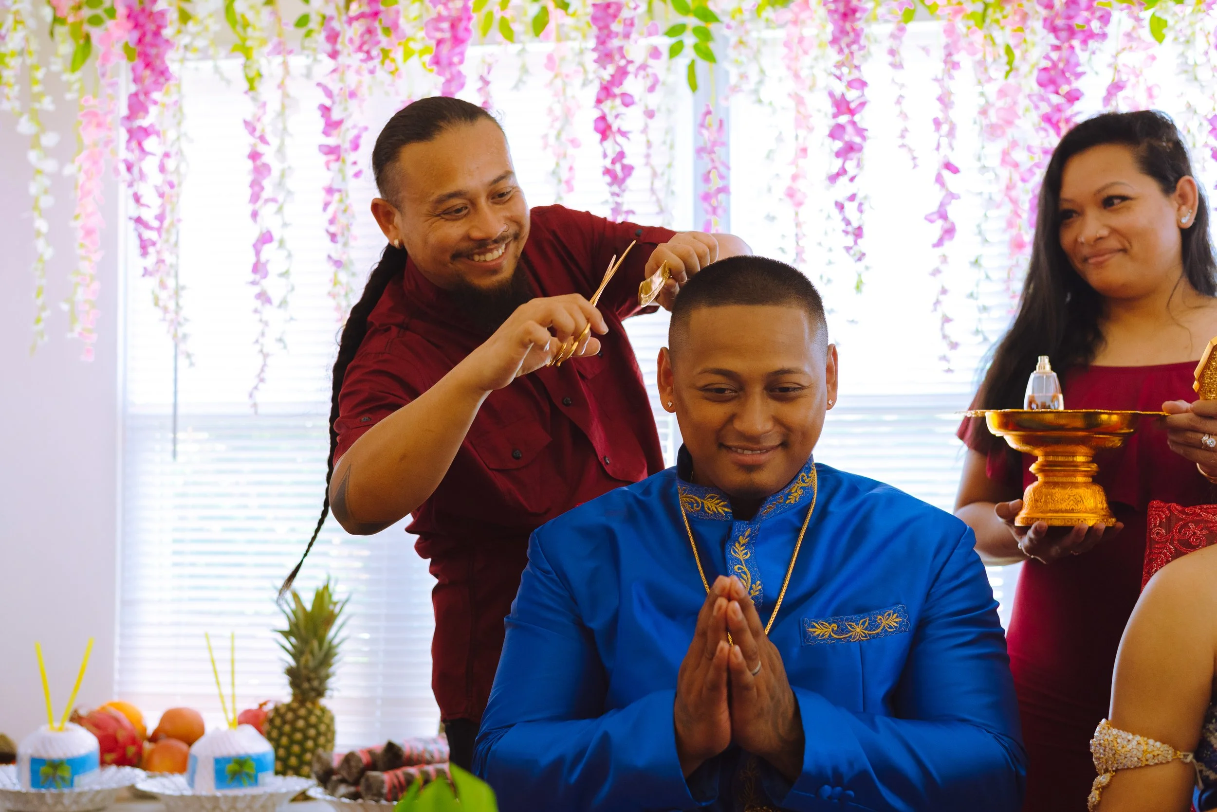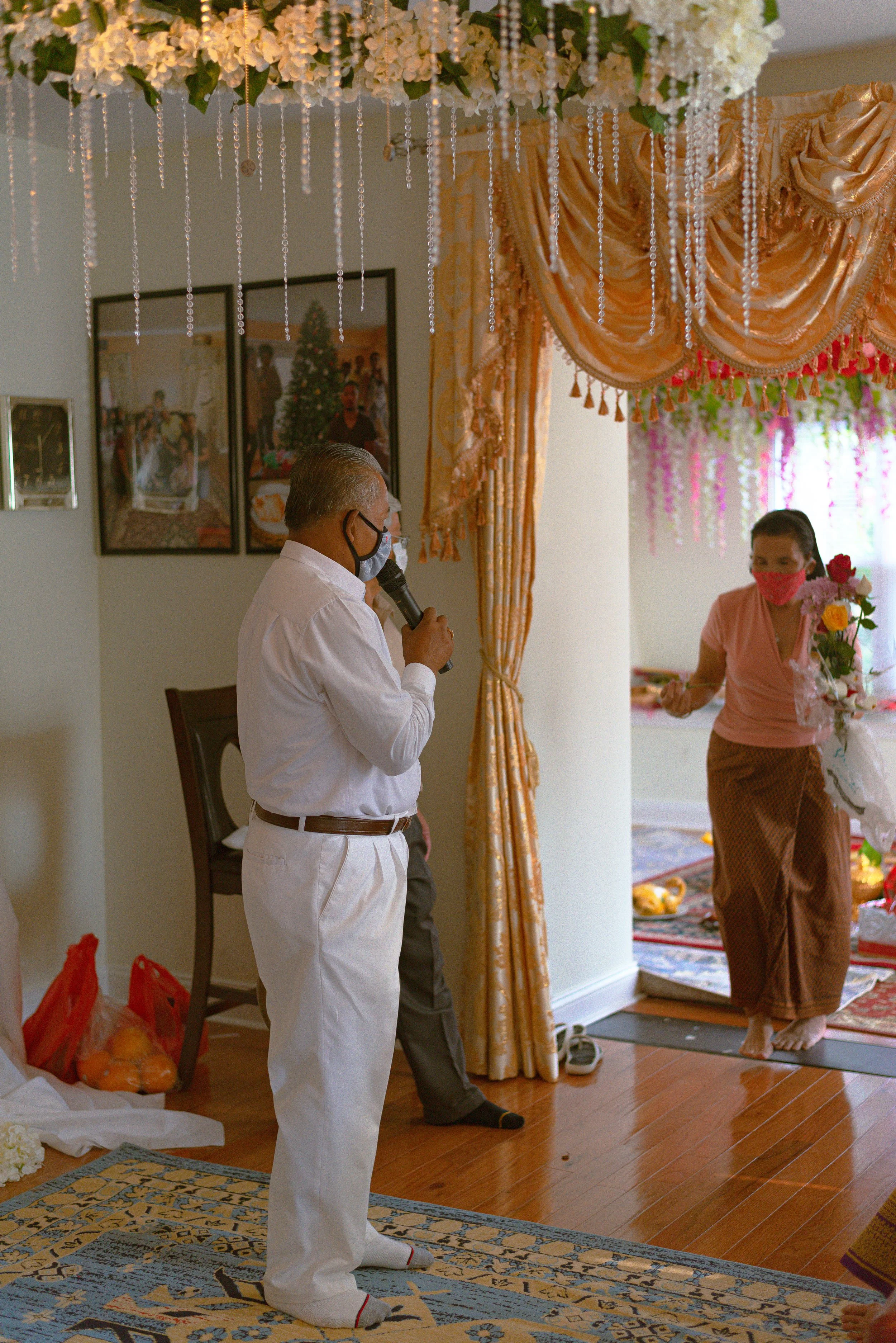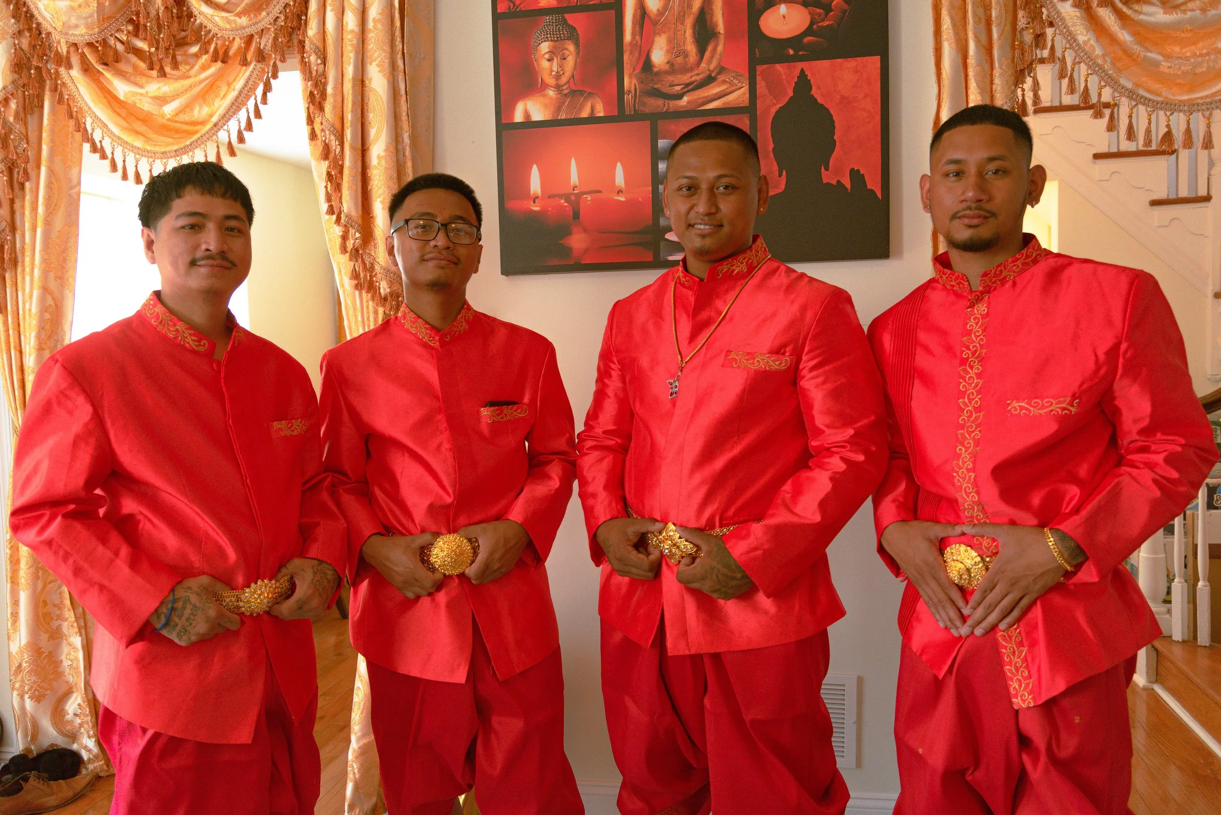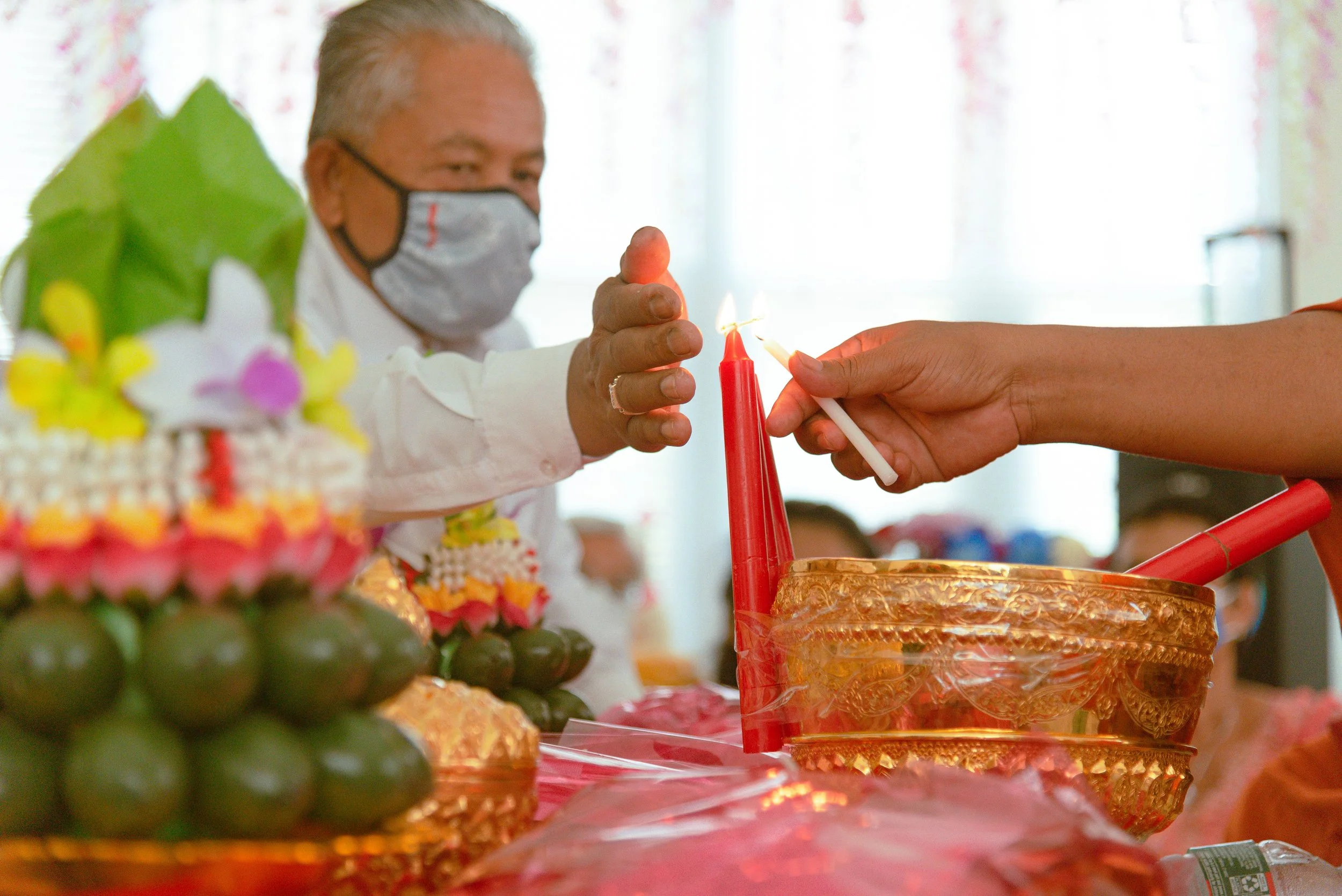 A majority Buddhist country, monks have a crucial role in Cambodian culture, including weddings. During this part of the ceremony, monks come to the home to bless the couple and their immediate family, who are all gathered in the sunroom. The monks lights special red candles before showering them in rose water while singing blessings. Everyone tries their best to remain silent, their heads are bowed and hands in prayer during the ceremony. Afterward, the bride and groom shows their respect and appreciation to the monks through the offering of gifts.
