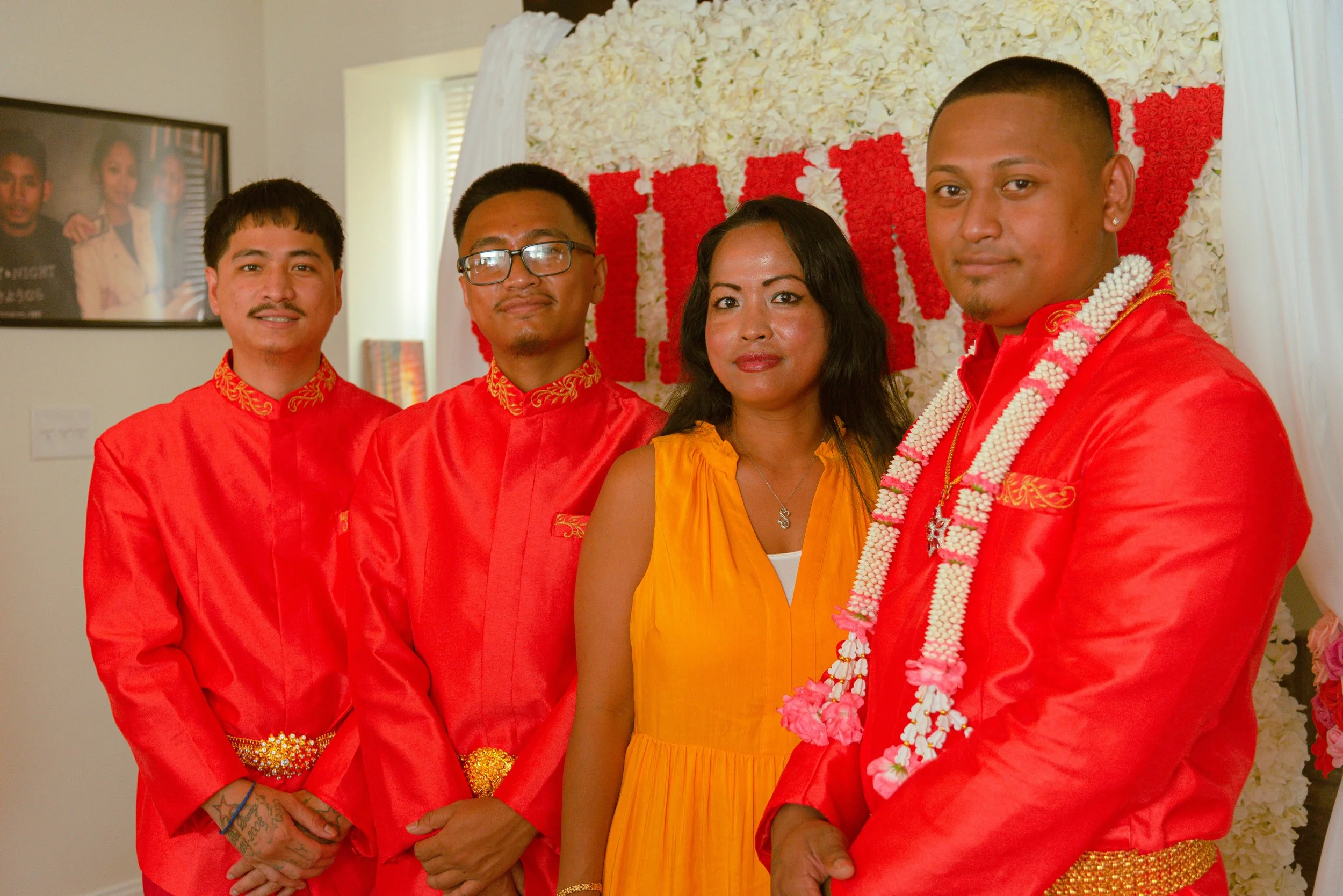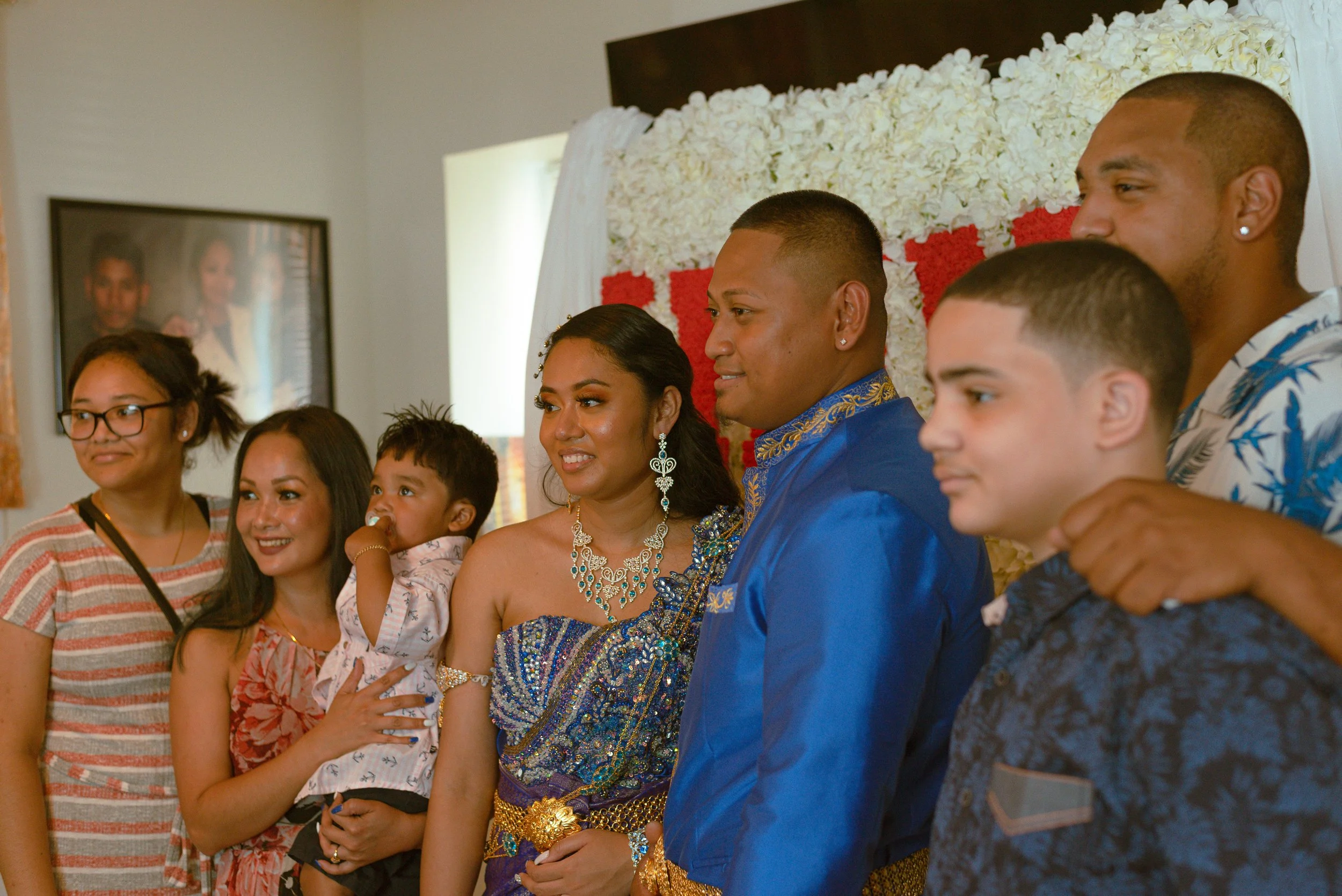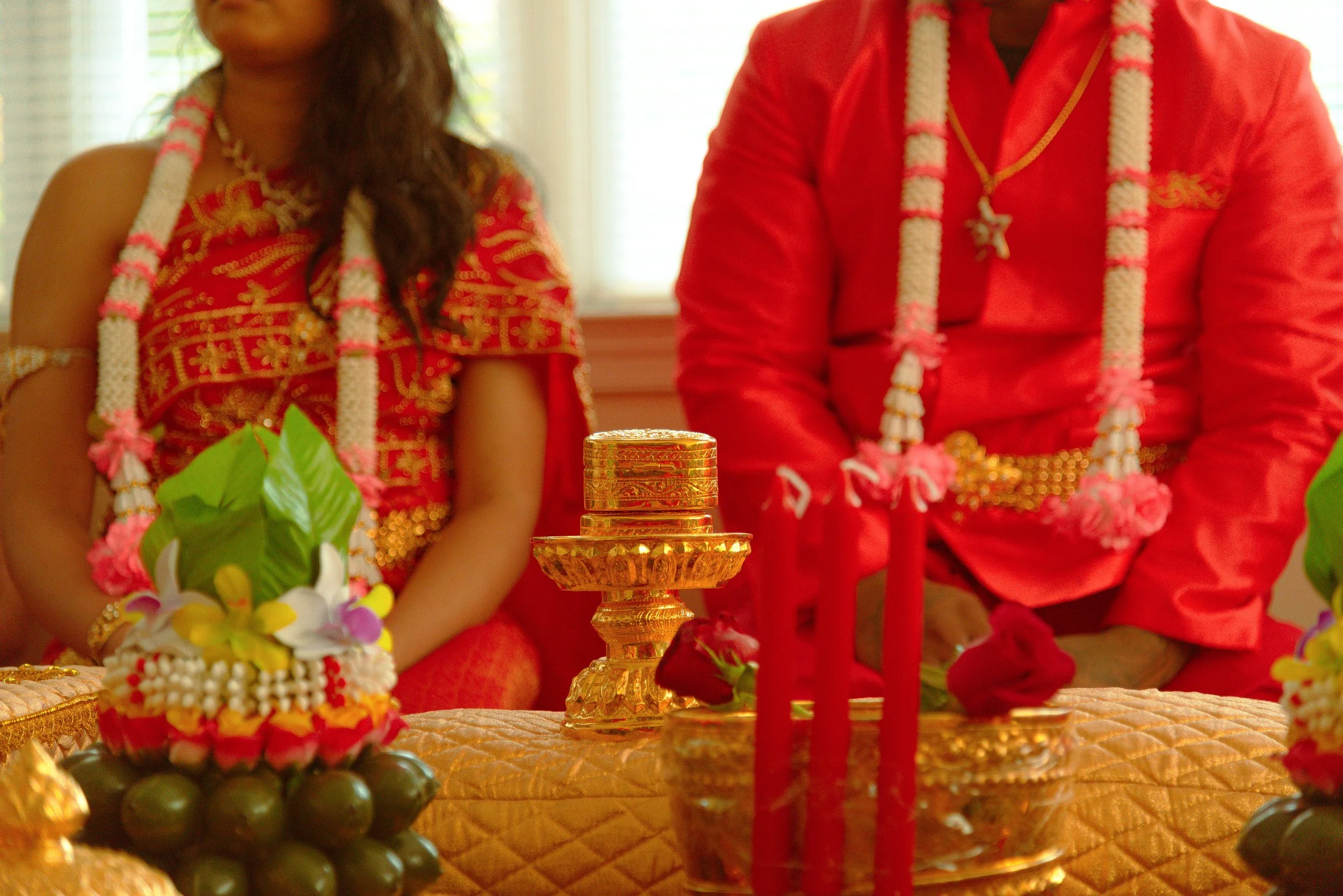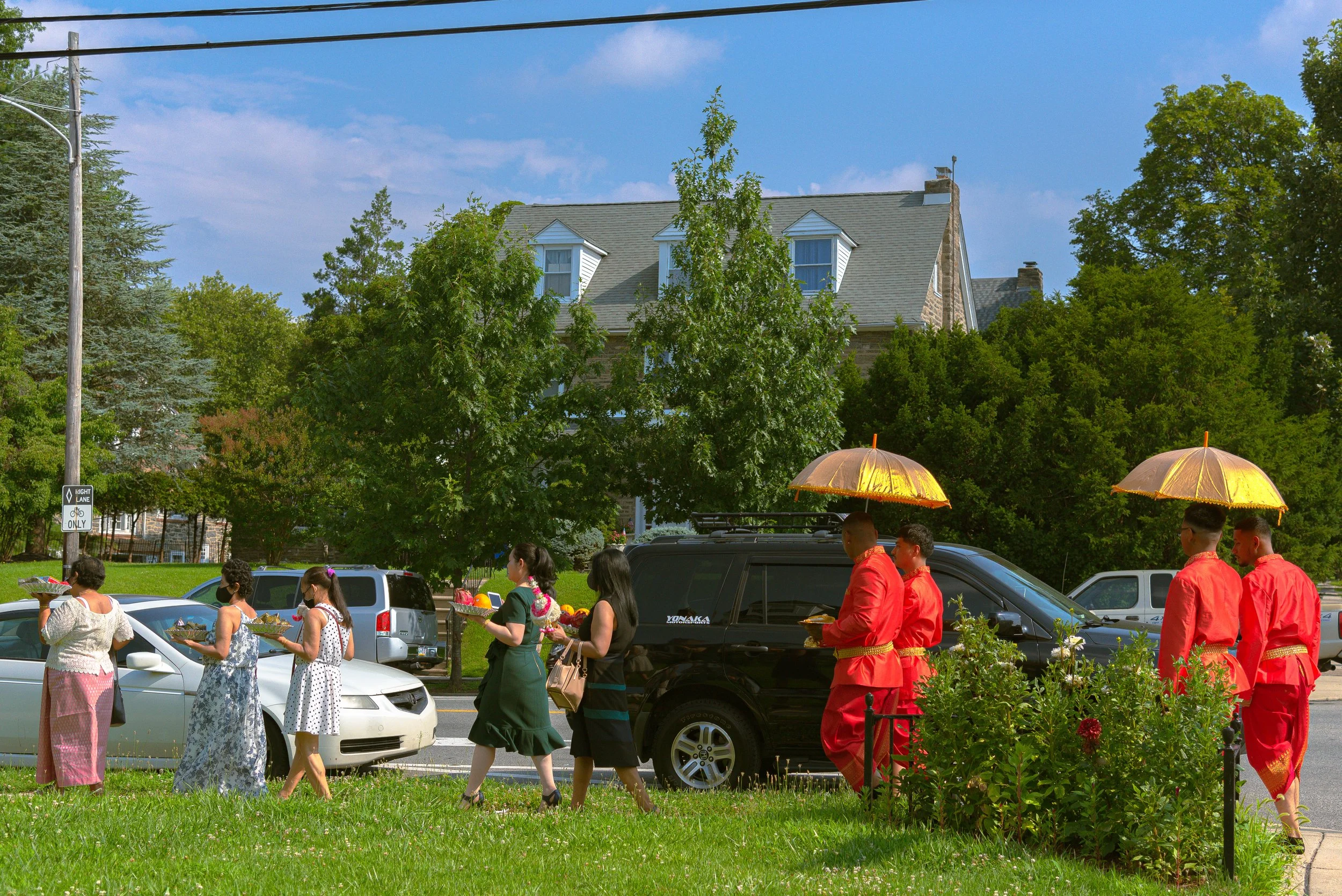 A majority Buddhist country, monks have a crucial role in Cambodian culture, including weddings. During this part of the ceremony, monks come to the home to bless the couple and their immediate family, who are all gathered in the sunroom. The monks lights special red candles before showering them in rose water while singing blessings. Everyone tries their best to remain silent, their heads are bowed and hands in prayer during the ceremony. Afterward, the bride and groom shows their respect and appreciation to the monks through the offering of gifts.
