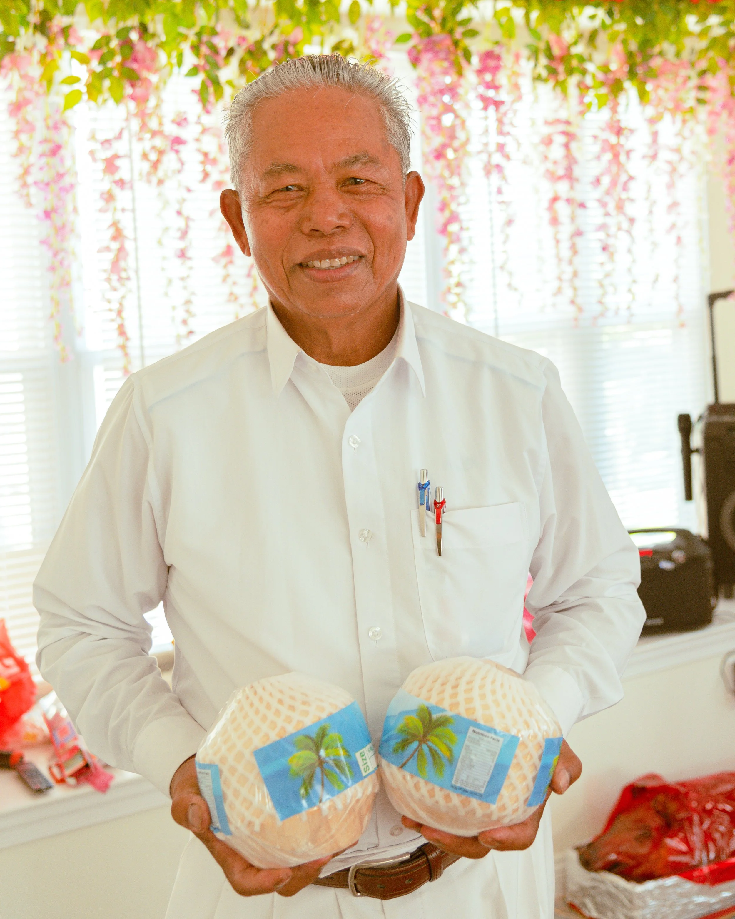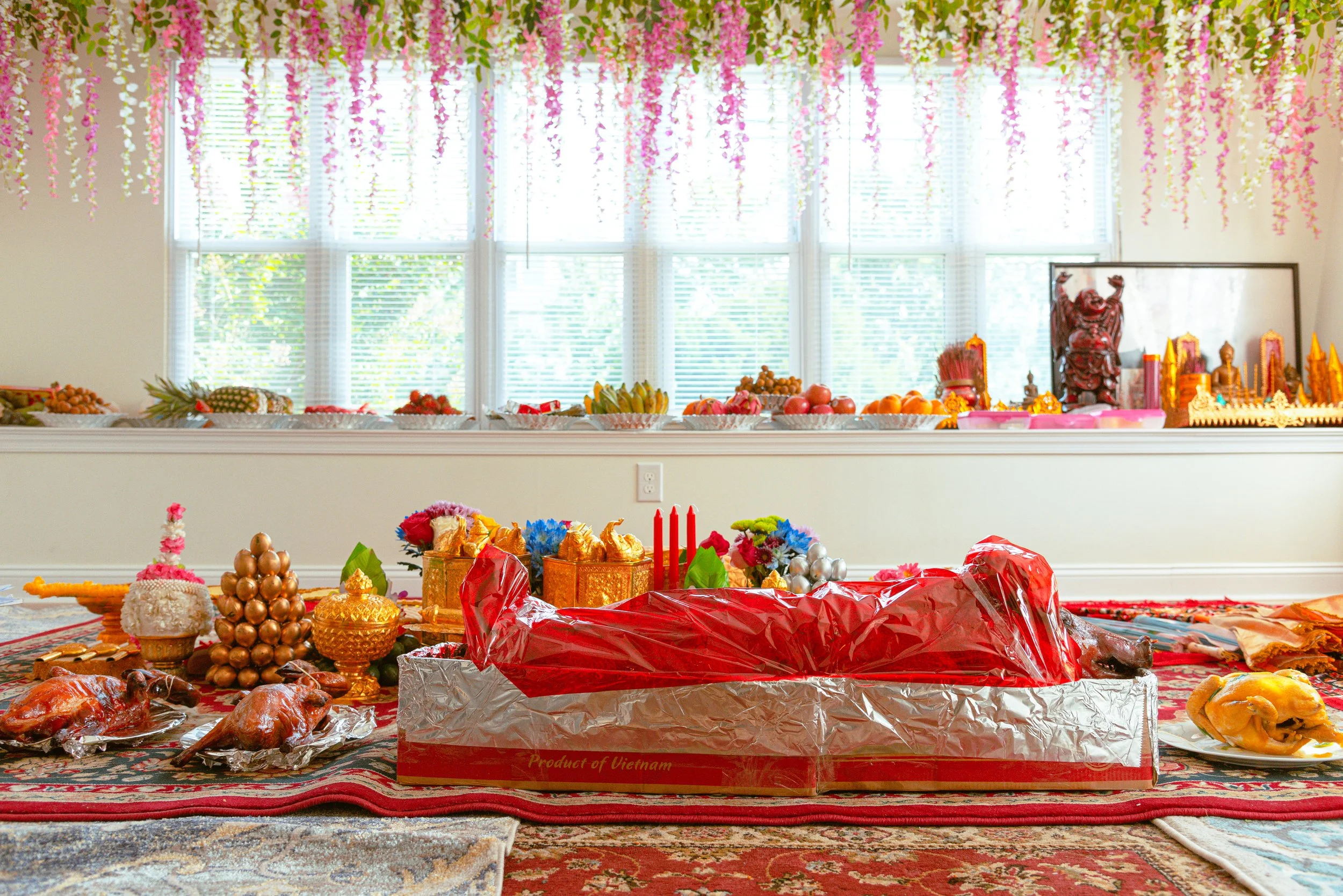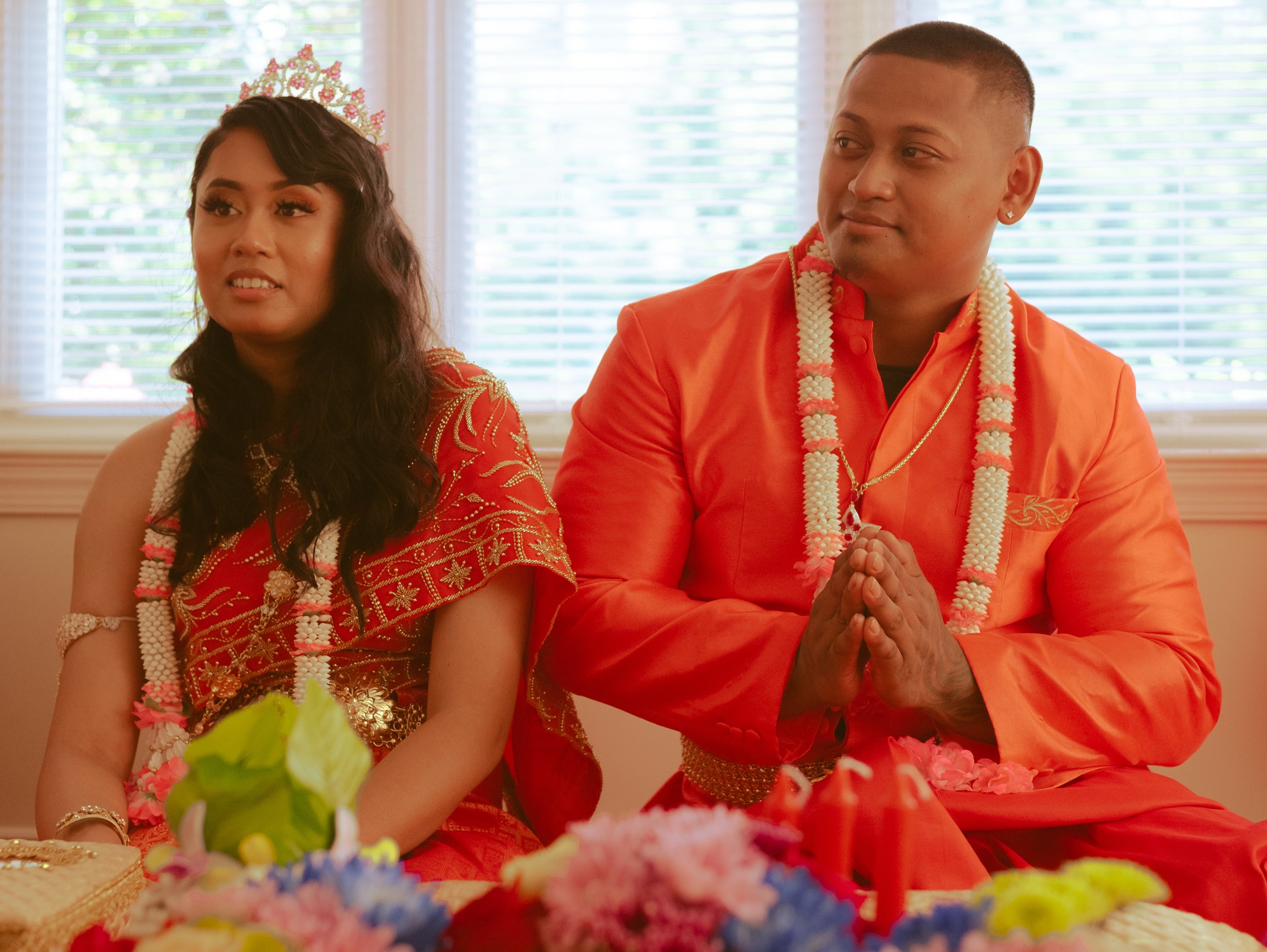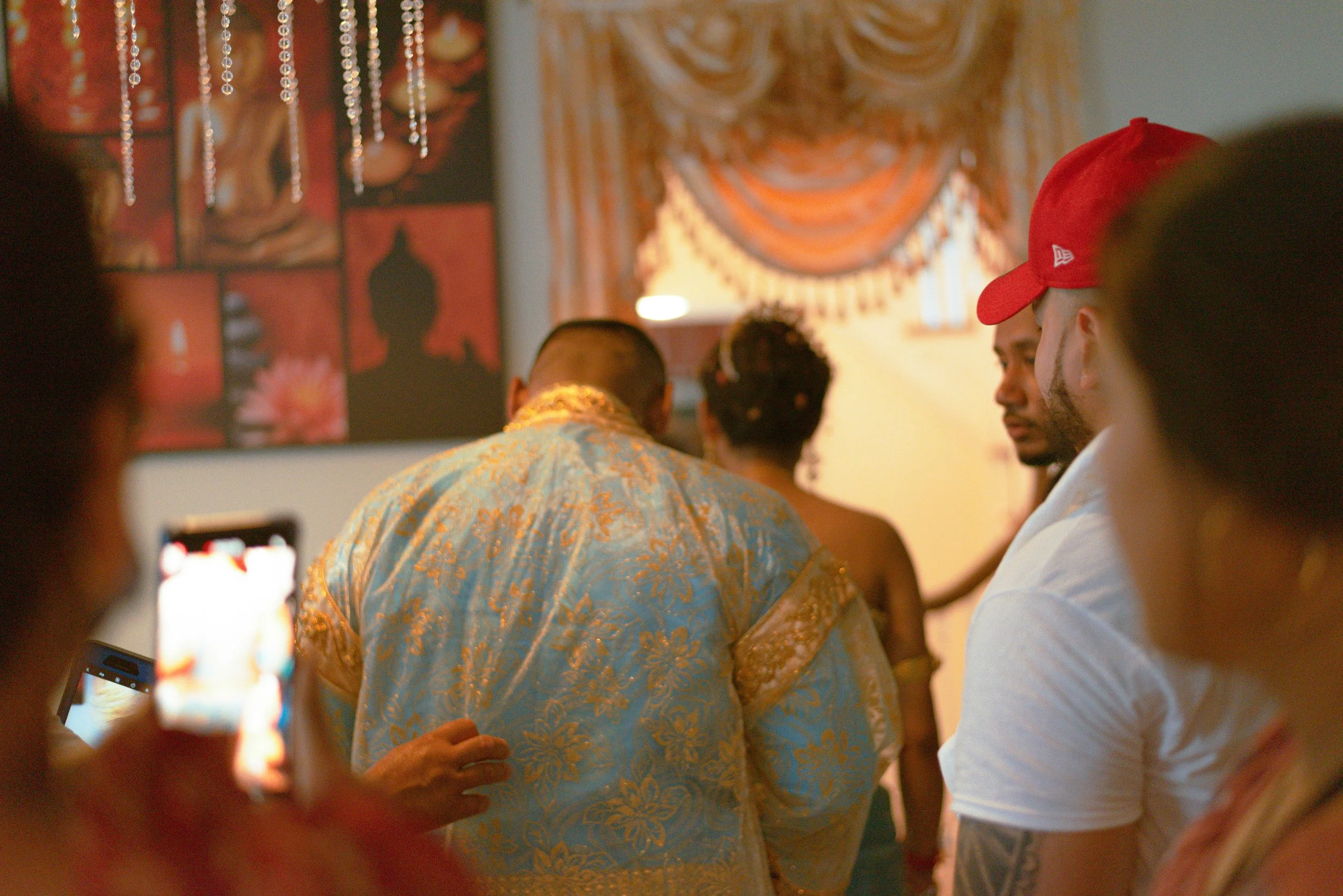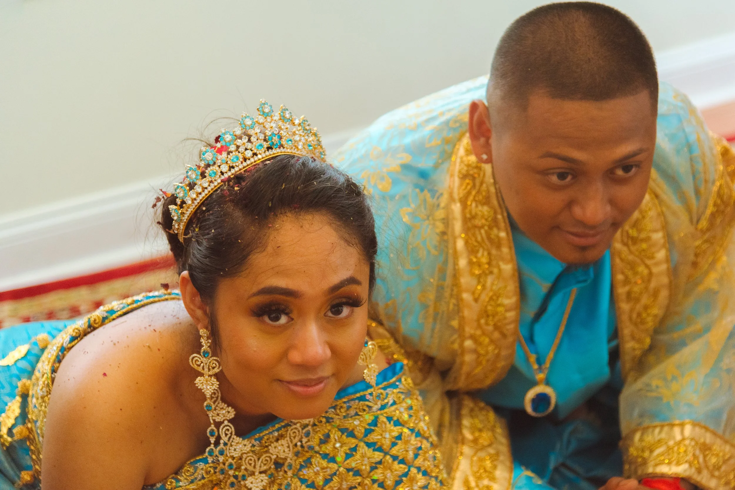A majority Buddhist country, monks have a crucial role in Cambodian culture, including weddings. During this part of the ceremony, monks come to the home to bless the couple and their immediate family, who are all gathered in the sunroom. The monks lights special red candles before showering them in rose water while singing blessings. Everyone tries their best to remain silent, their heads are bowed and hands in prayer during the ceremony. Afterward, the bride and groom shows their respect and appreciation to the monks through the offering of gifts.