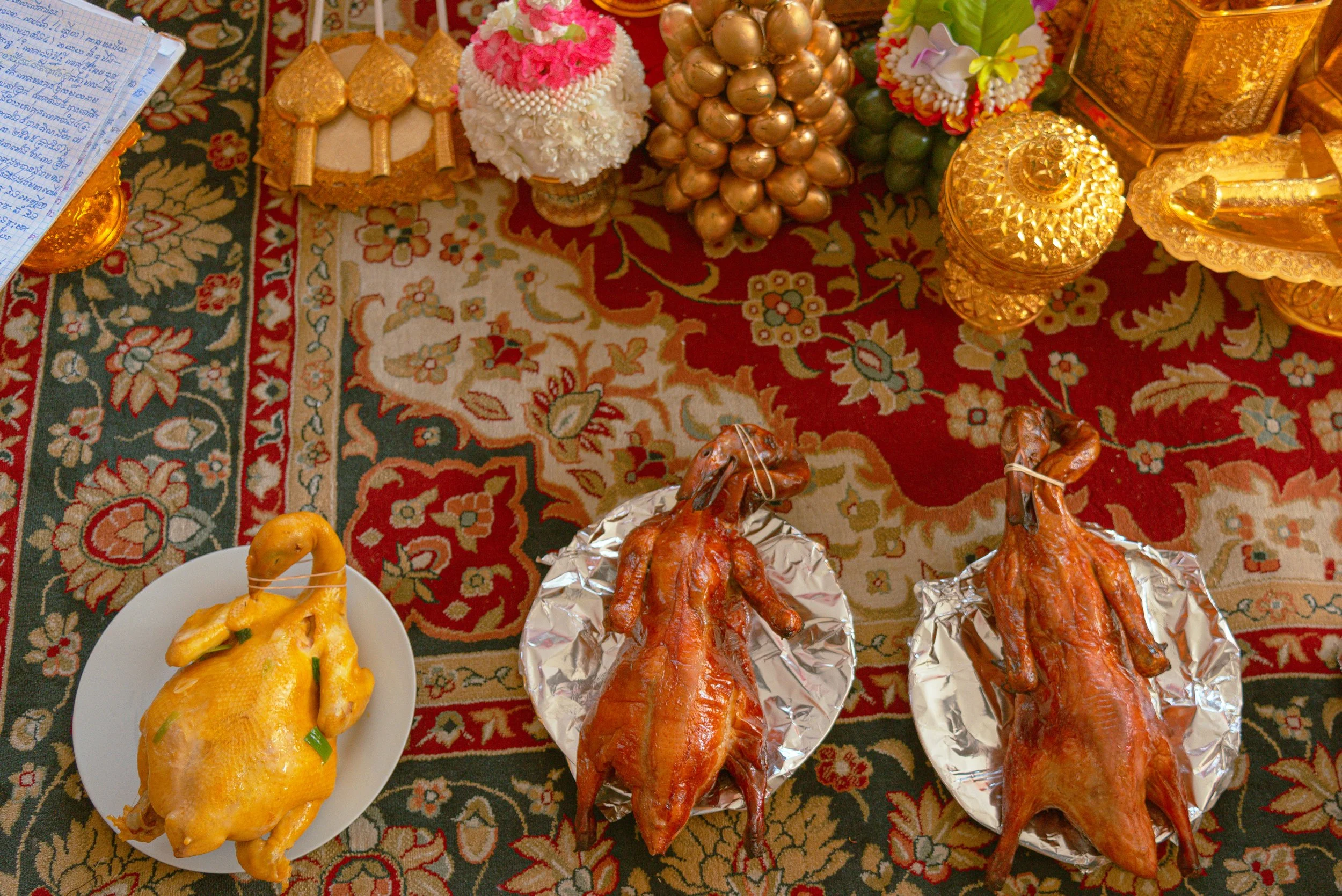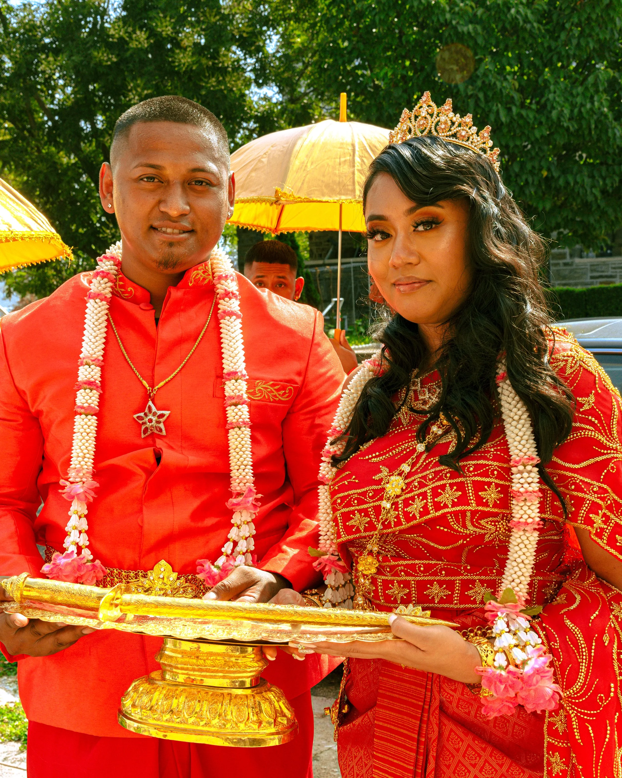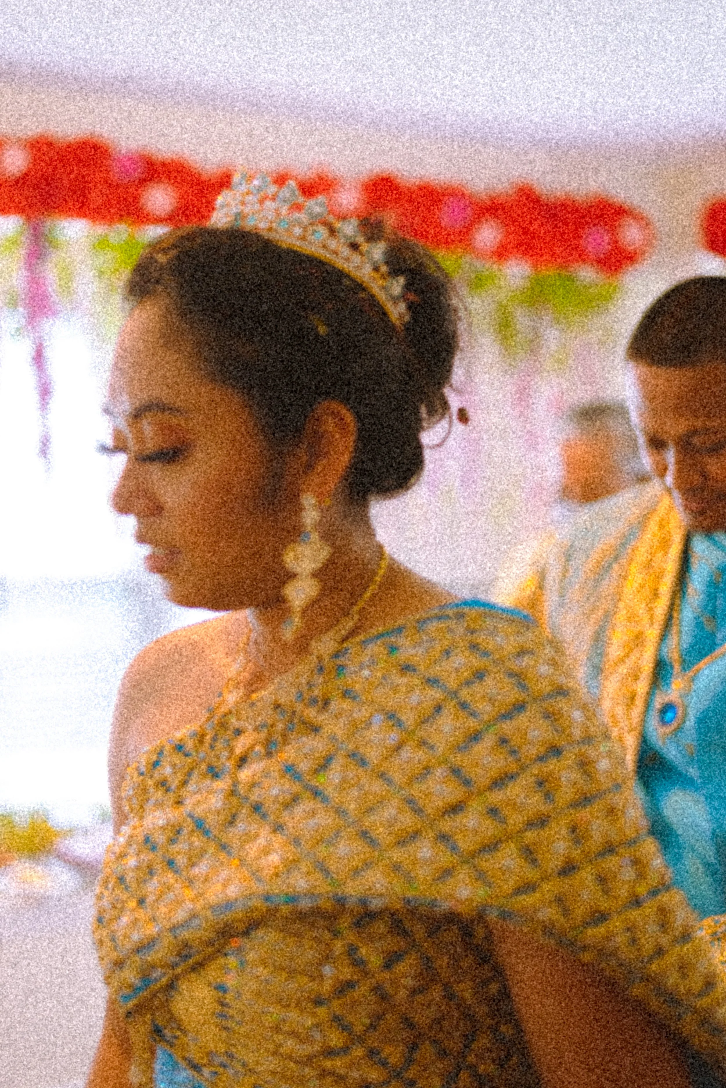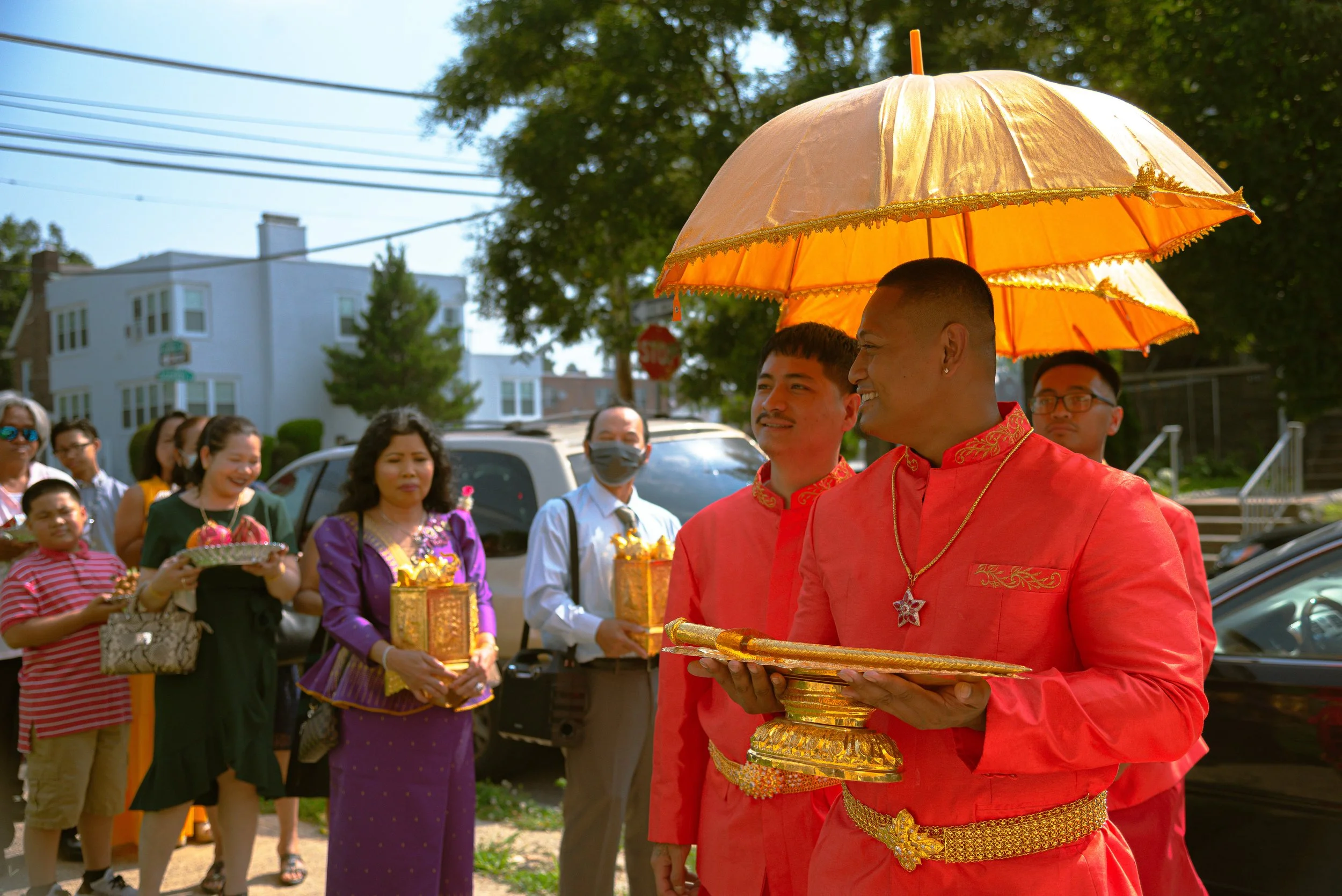 Standing beneath golden umbrellas, the groom walks toward the bride’s family home where she awaits his arrival. He holds a golden tray, and on it a golden sword. Behind him, are his family, friends, and guests, all bearing gifts to be laid out as an offering to the bride’s family - a gesture of respect and proof of his ability to provide. Khmer marriage is not just a union between two individuals but between their two families.